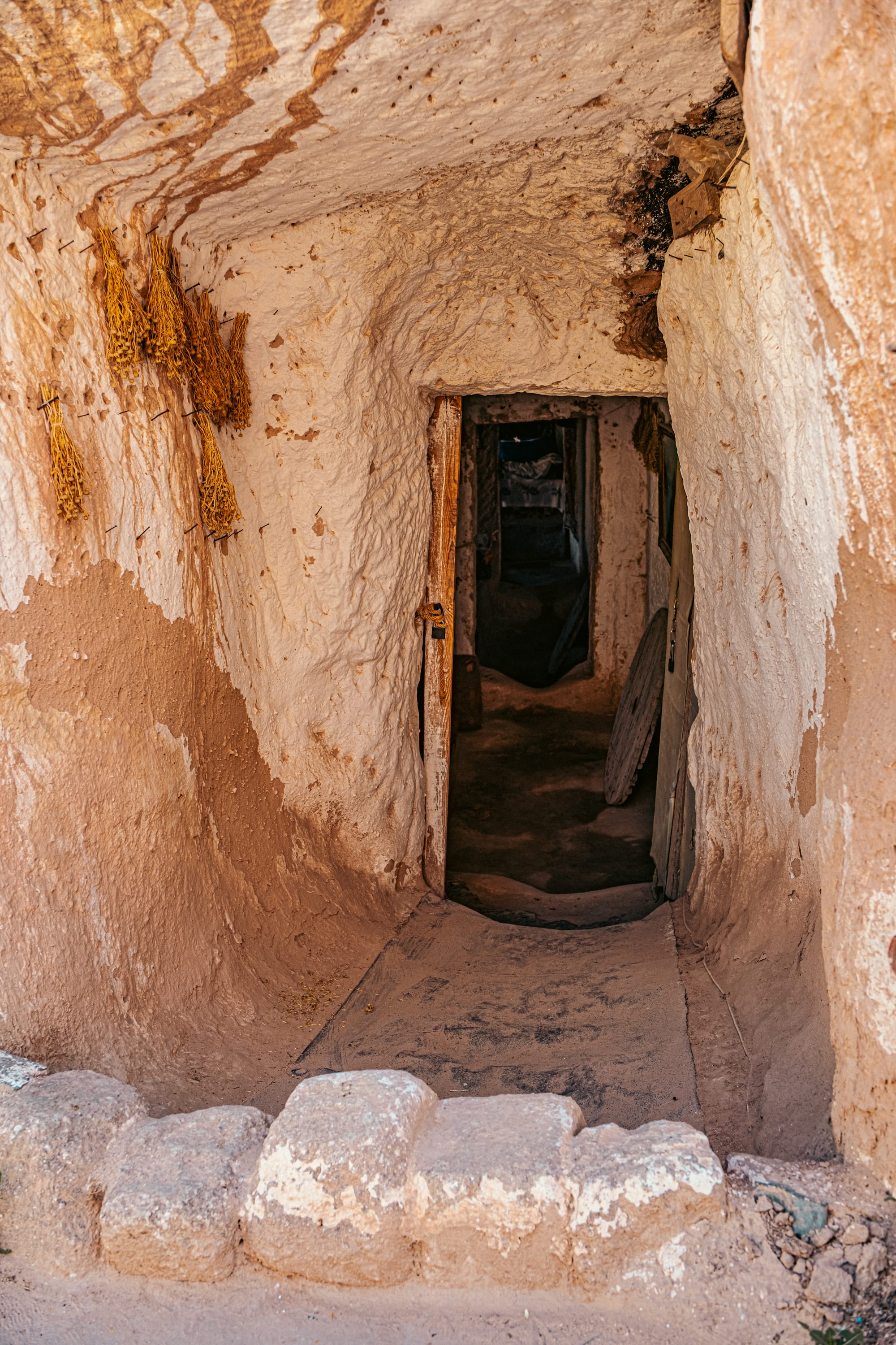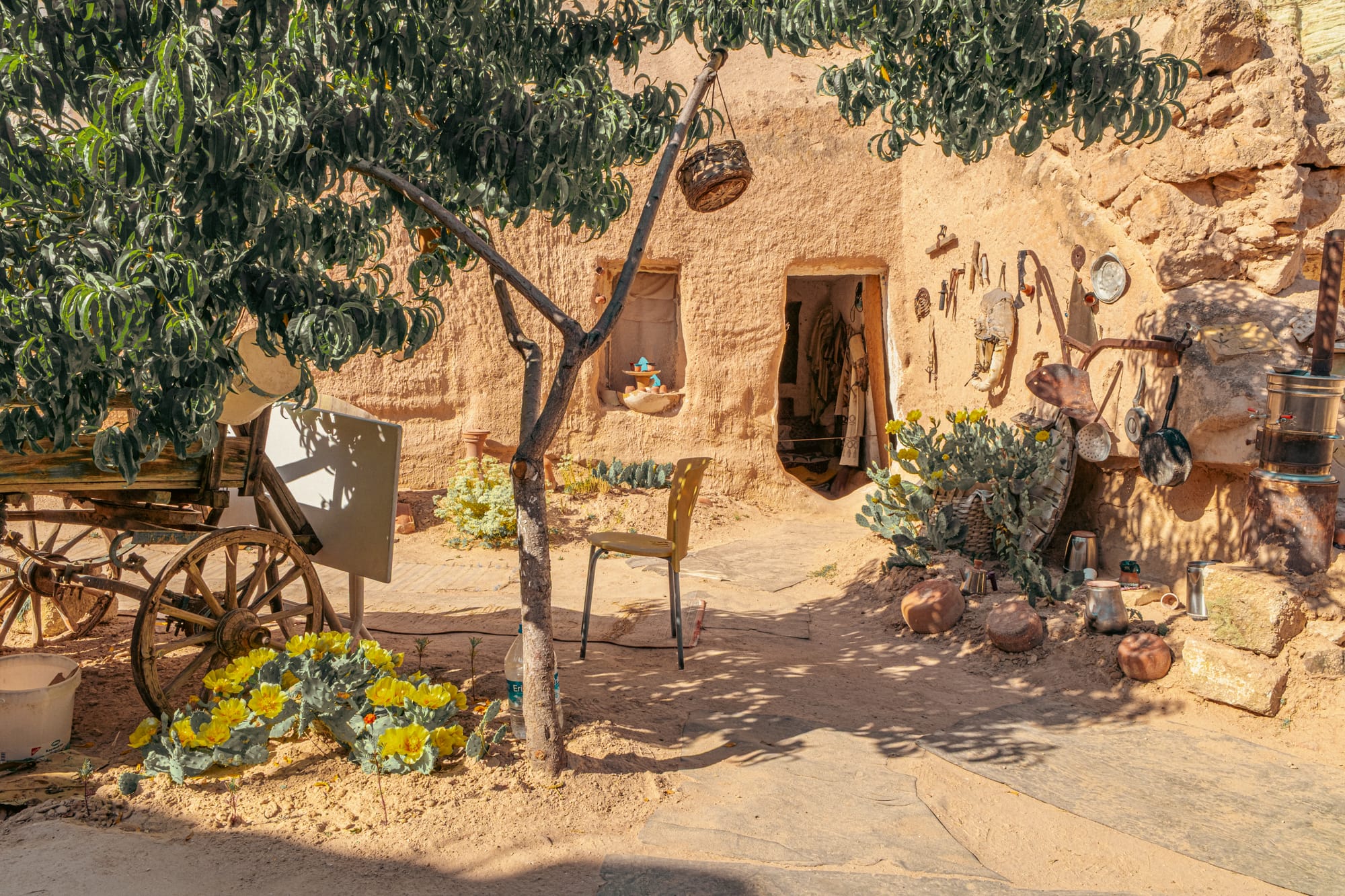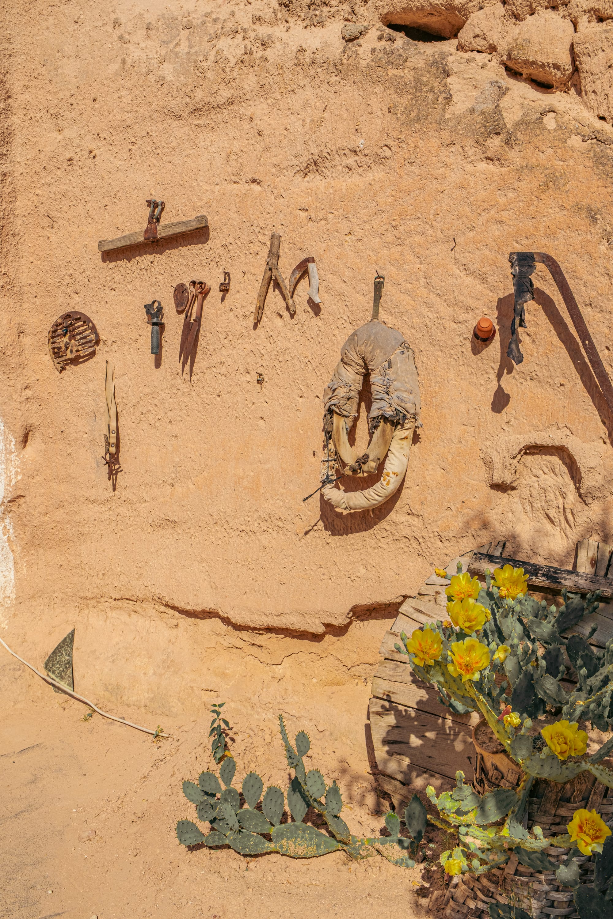 Courtyard wall with hanging tools and cactus blooms beside a tunnel entrance into the home