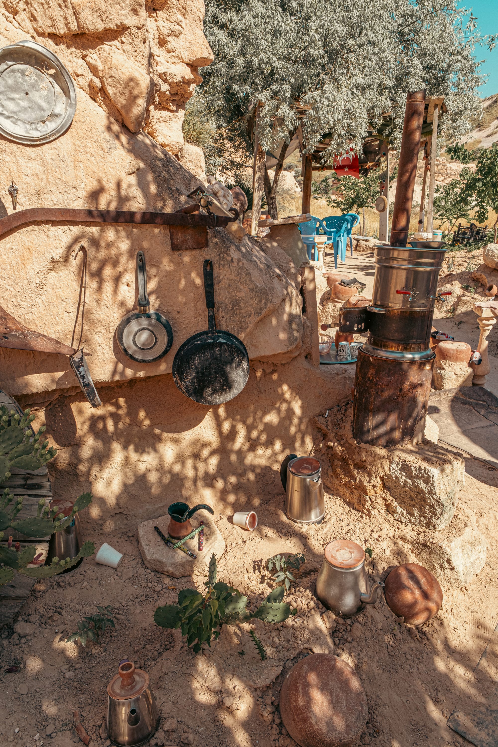 Outdoor cooking area with hanging pans and kettles beside a shaded stall