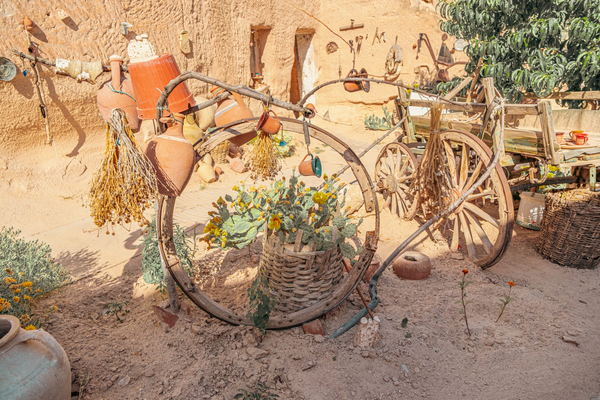 Courtyard at Tarihi Ev adorned with blooming cacti, rustic tools, and weathered wooden carts