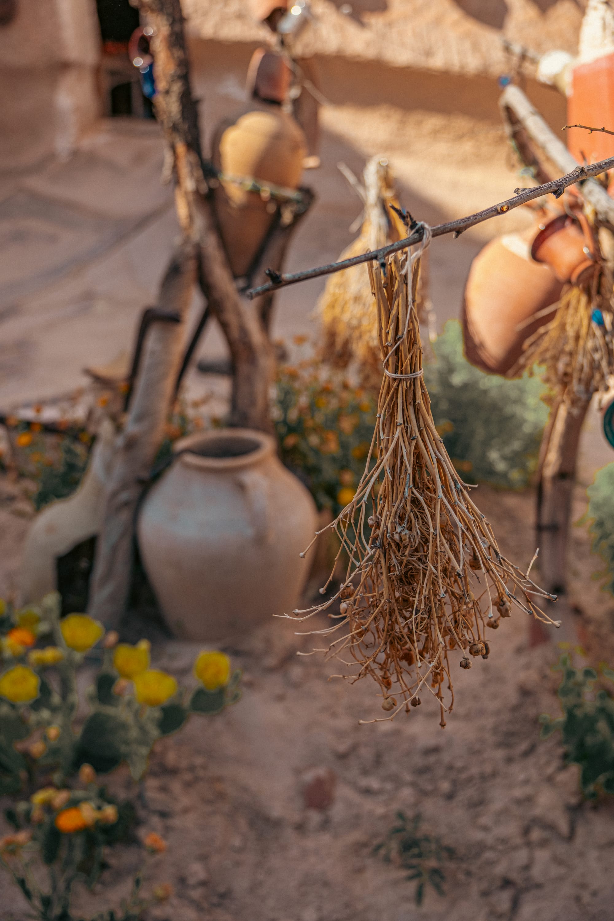 Clay cups displayed in a wall niche and dried herbs hanging beside courtyard pottery