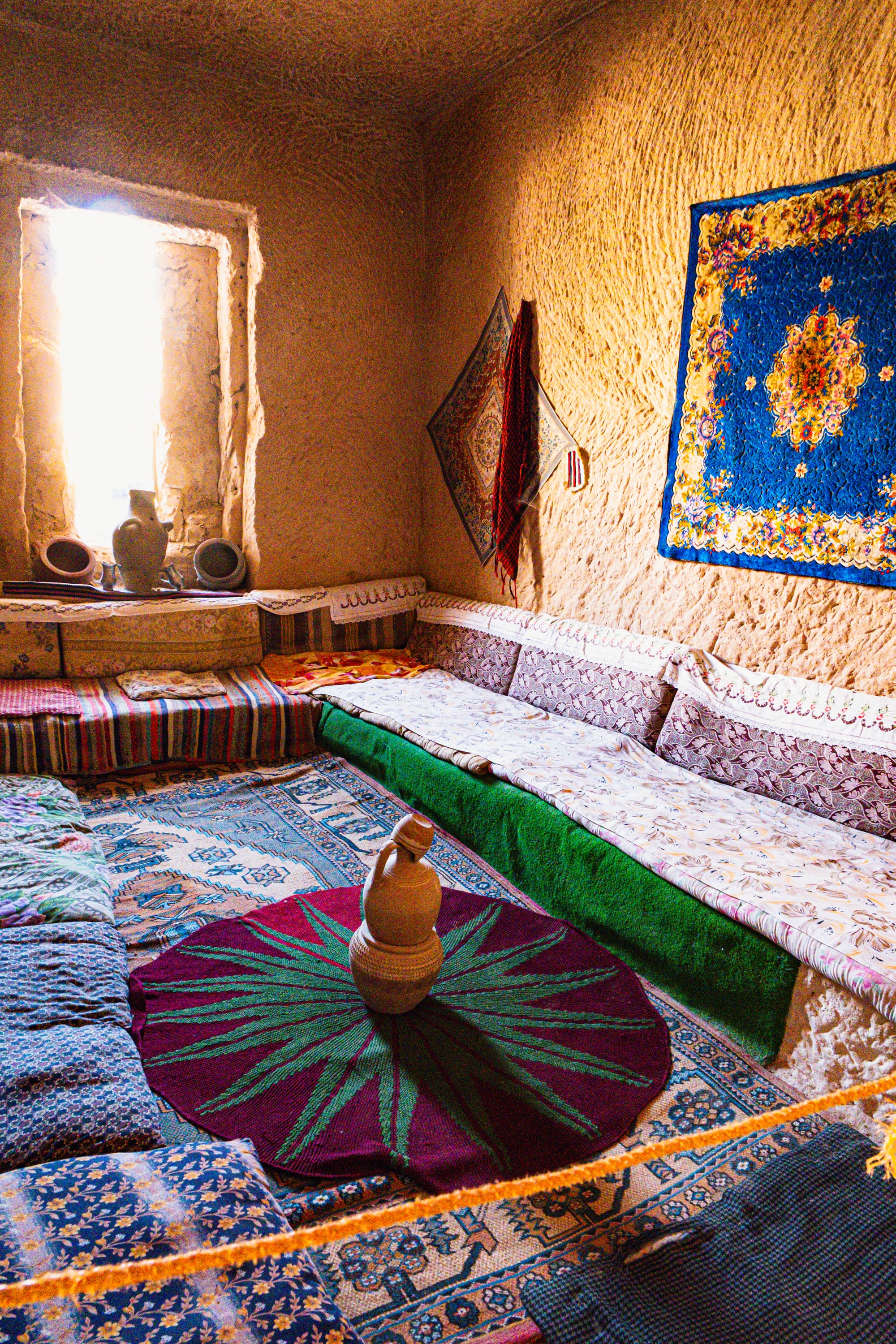 Light changes the atmosphere hour by hour. In the morning, soft light spills across the rugs, catching the edges of embroidery. By midday, bright shafts illuminate small details—patterns in the weave of a cushion, the glint of copper. Late afternoon warms everything to a golden hue, the colors of the room deepening as shadows lengthen.