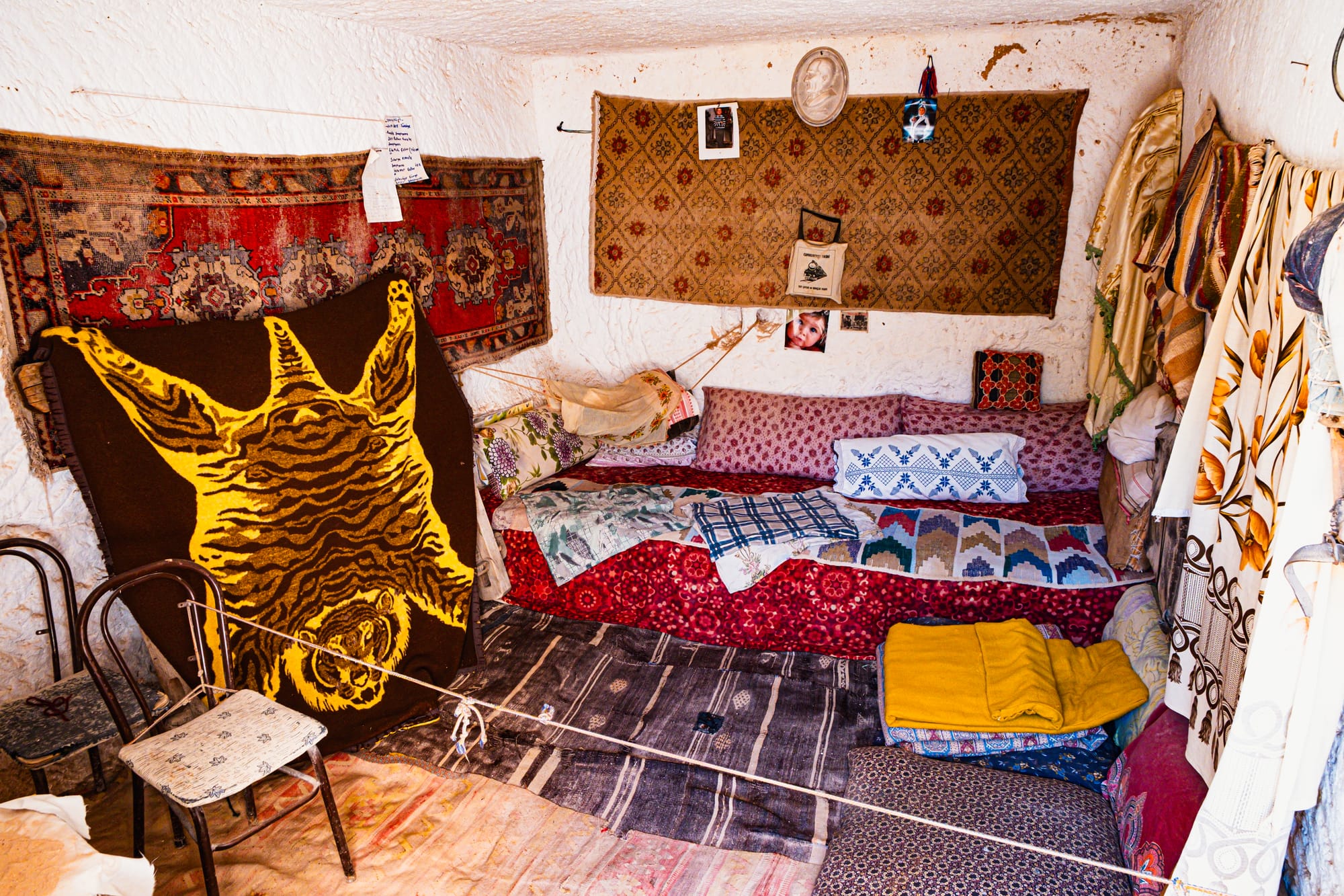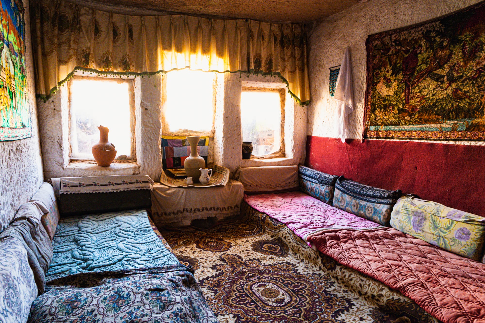 The interiors are textured and deeply atmospheric. Floors are covered with kilims whose colors have softened with age—reds, blues, and ochres worn by countless footsteps. Low wooden tables rest beside benches draped in patterned fabrics, and on the walls hang thick blankets and woven tapestries, both decorative and practical.