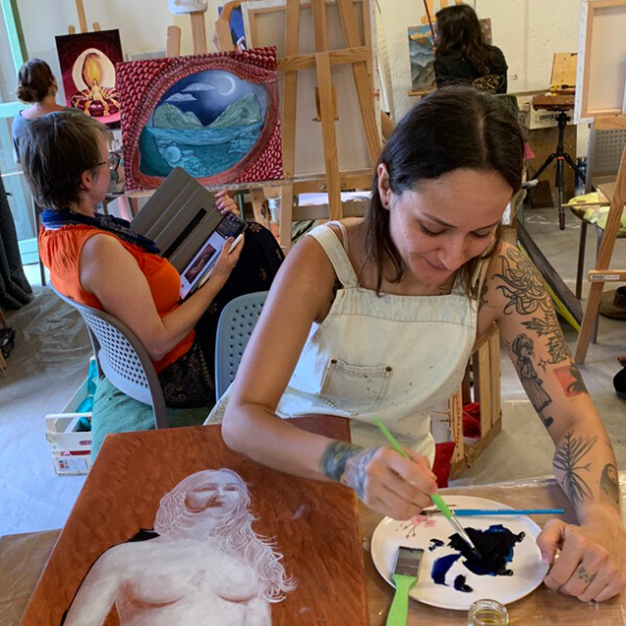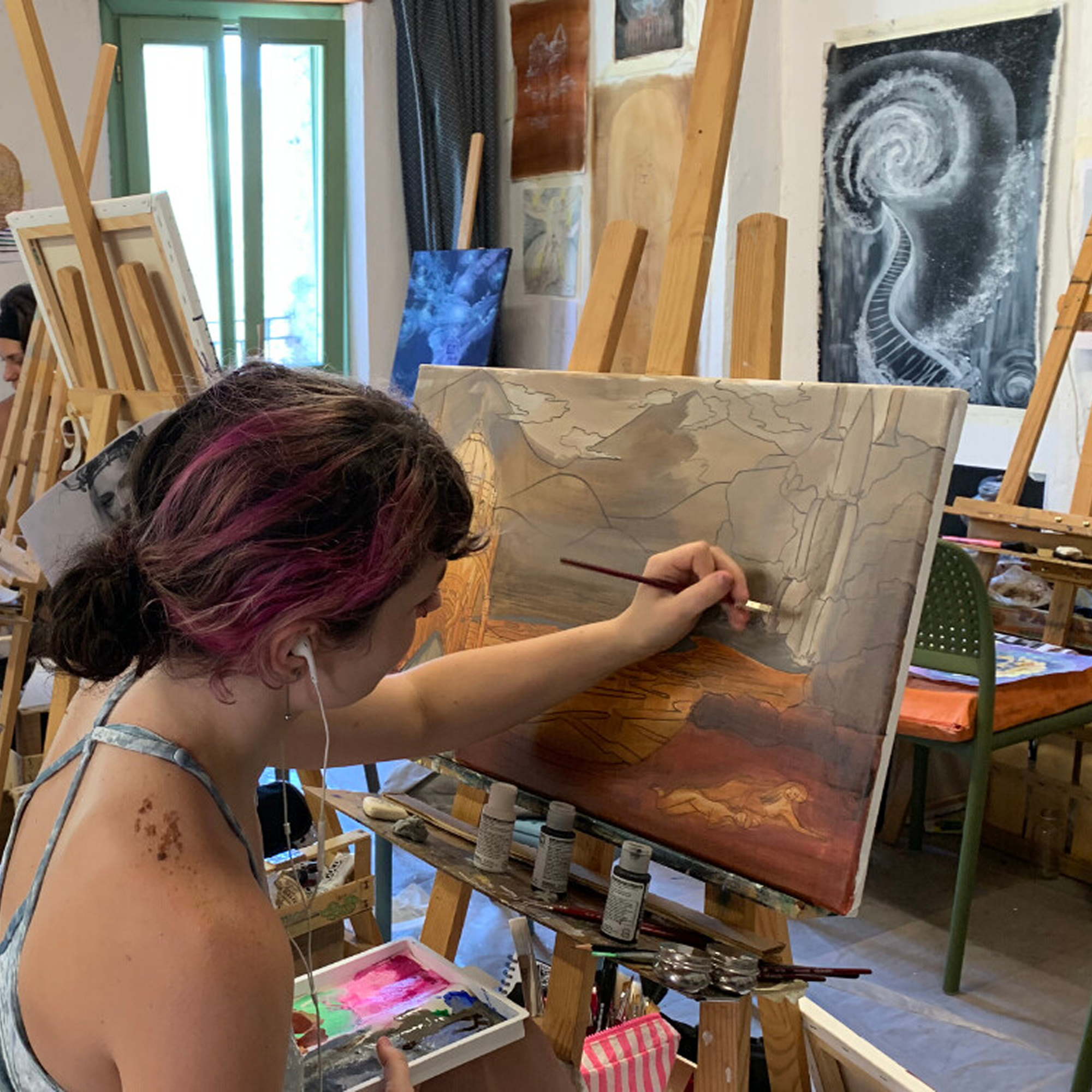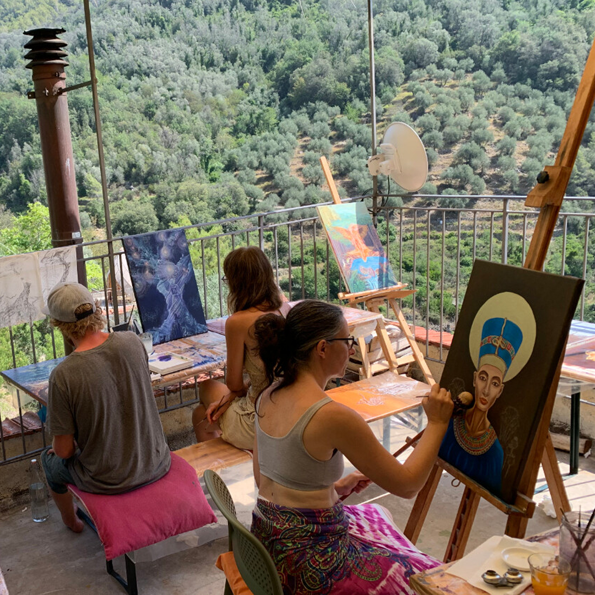 The Academy of Visionary Art is situated within the Italian ecovillage of Torre Superiore, a labyrinthine site of spiraling stairs and narrow passages, built from the local limestone in 1300. It is dedicated to teaching traditional painting techniques while fostering individual creativity and the pursuit of visionary art—art that transcends the physical world and portrays a wider vision of awareness, often incorporating spiritual and symbolic elements.
