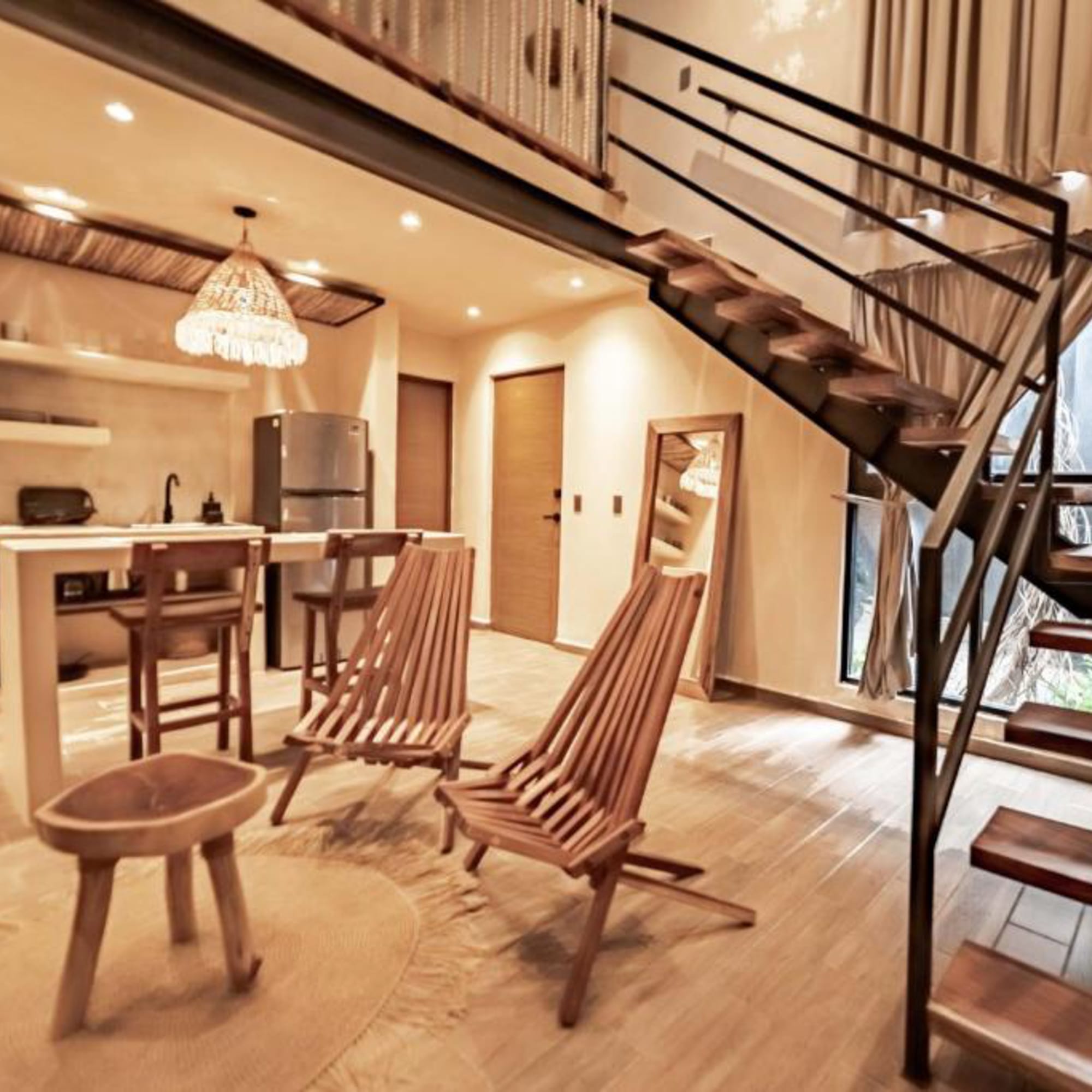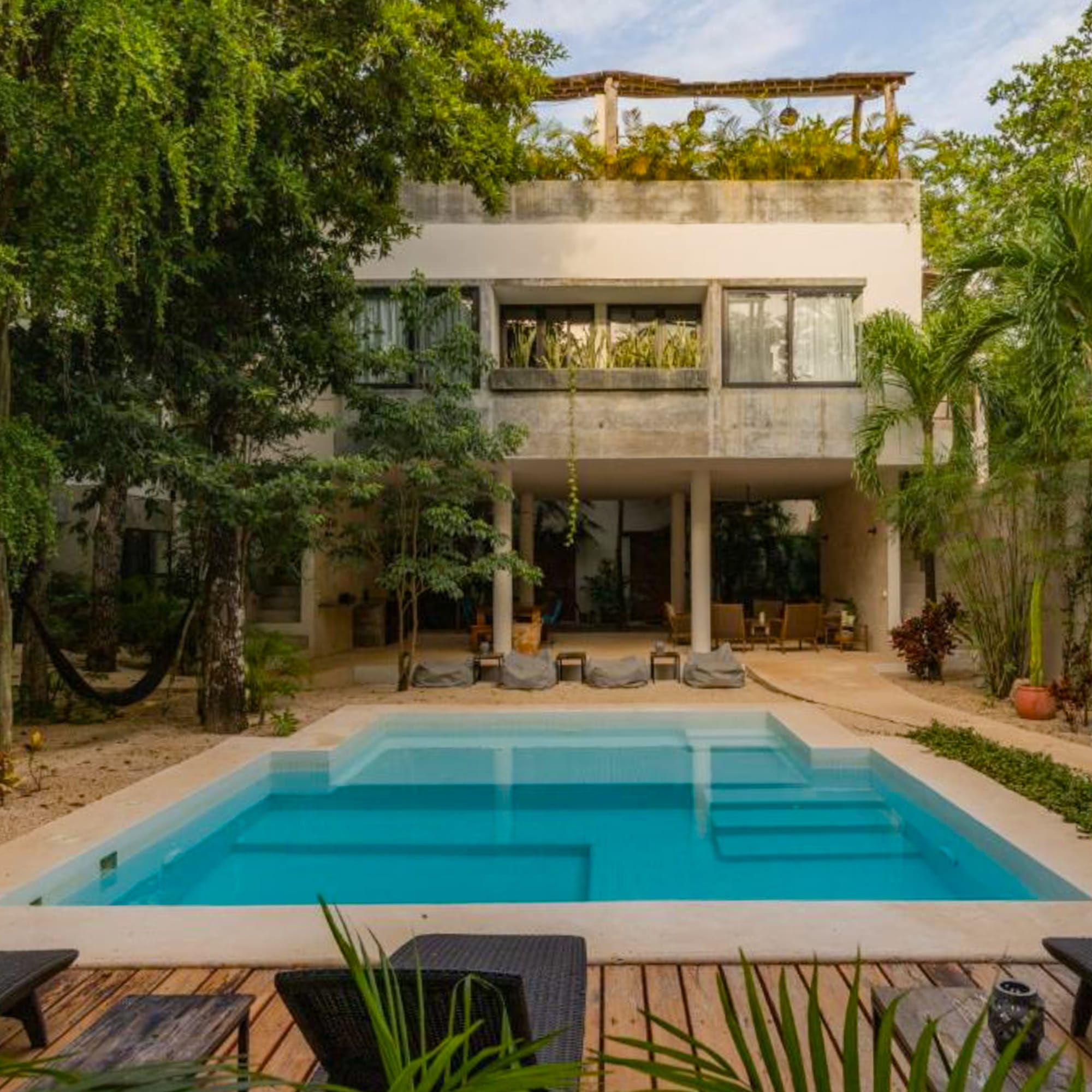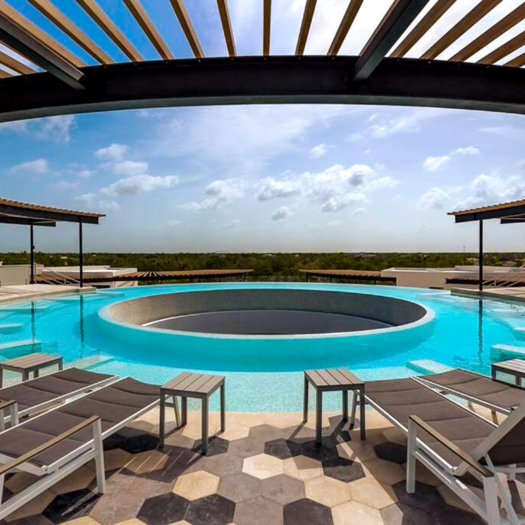 A modern apartment complex in Tulum known for its striking rooftop spaces and expansive jungle views. Units are designed with full kitchens, work-friendly interiors, and large terraces, making them suitable for longer stays or remote work. The building’s standout feature is its rooftop pools.