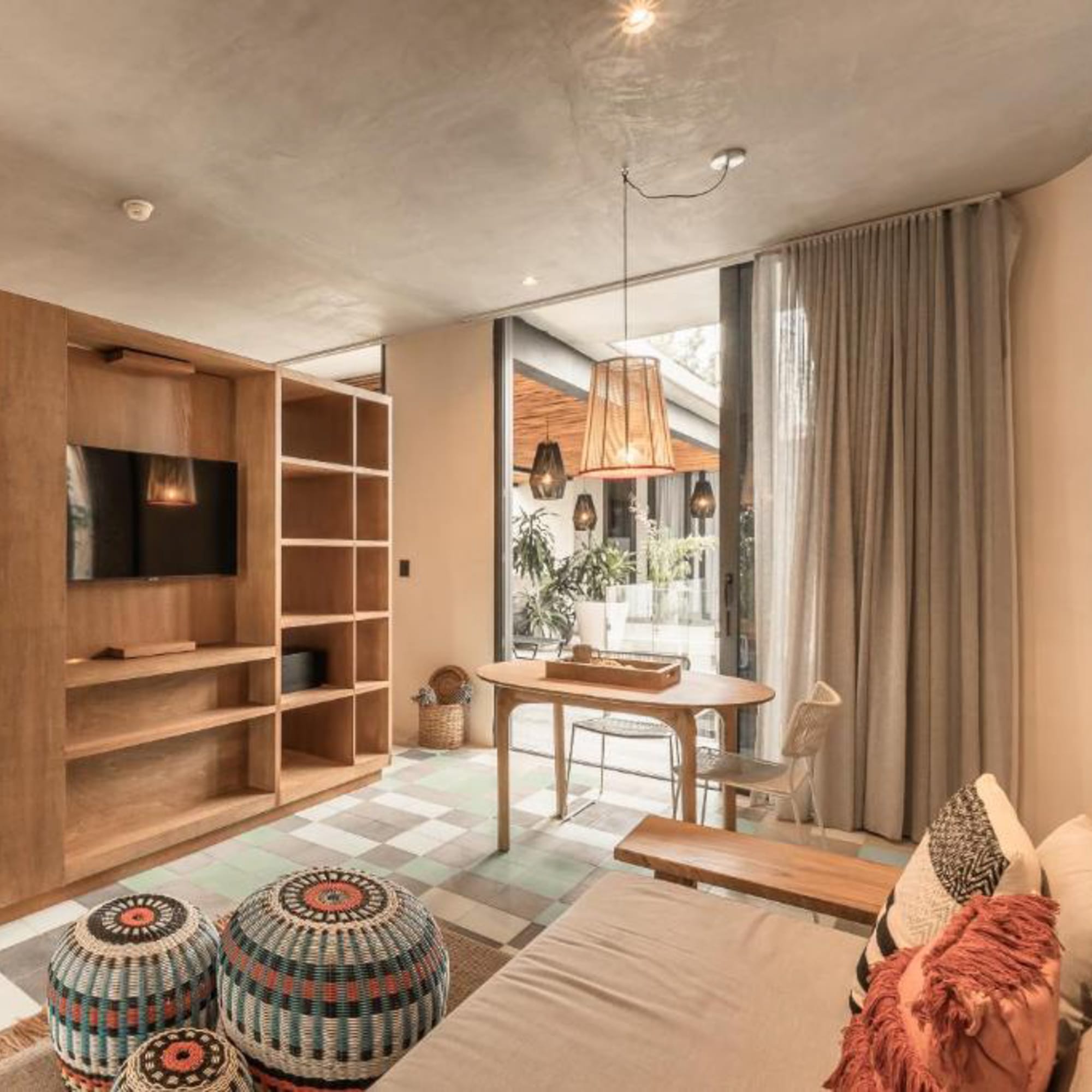 A luxury aparthotel in Tulum known for its striking architecture and highly aesthetic design. Spacious apartments feature private plunge pools, full kitchens, and balconies overlooking lush, carefully landscaped spaces. It’s a refined option for travelers seeking an upscale stay.