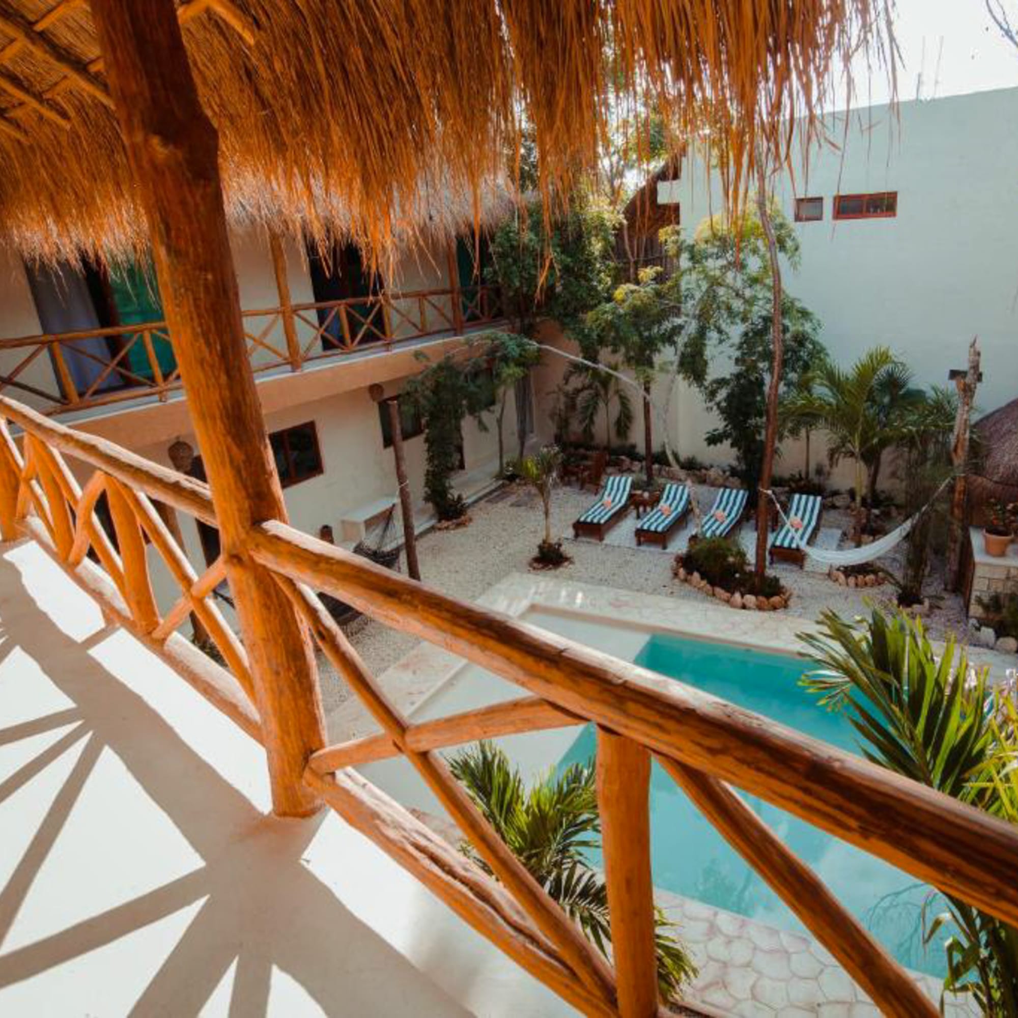A small apartment-style stay in Tulum offering rooms with kitchenettes, balconies, and garden or pool views. The property centers around a lush courtyard with a year-round pool and sun terrace, creating a relaxed atmosphere away from the busier streets.