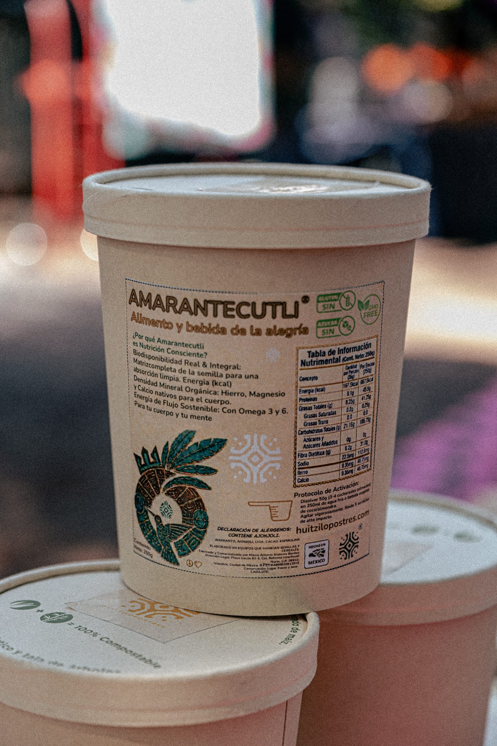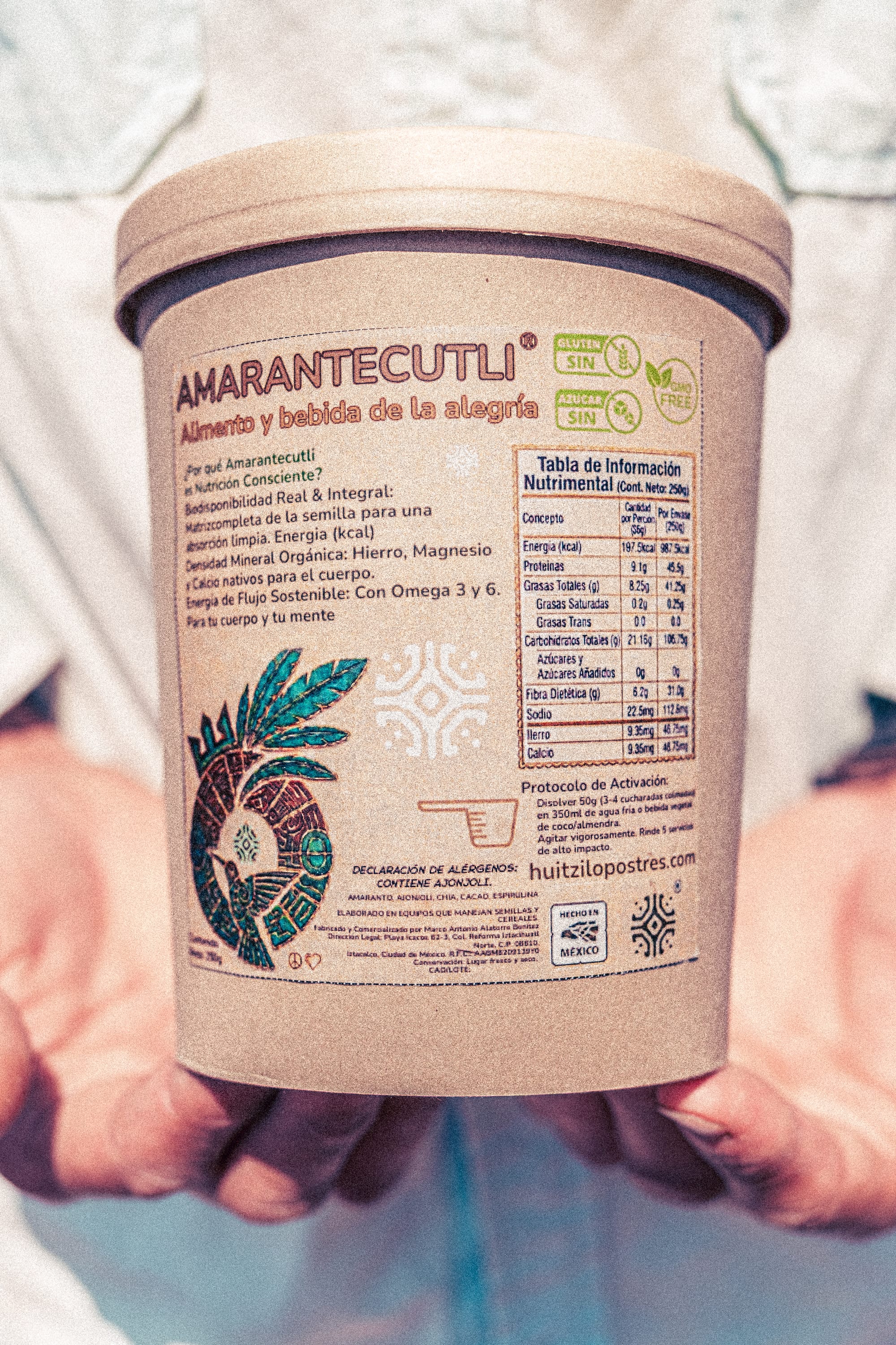 Products like Alegría (amaranth with organic honey), Tzoalli Xocolapinolli (a drink made with amaranth, chia, and ceremonial cacao), and Amarantecutli (a dense nutritional blend rooted in ancestral formulations) extend the logic of the rooftop outward.