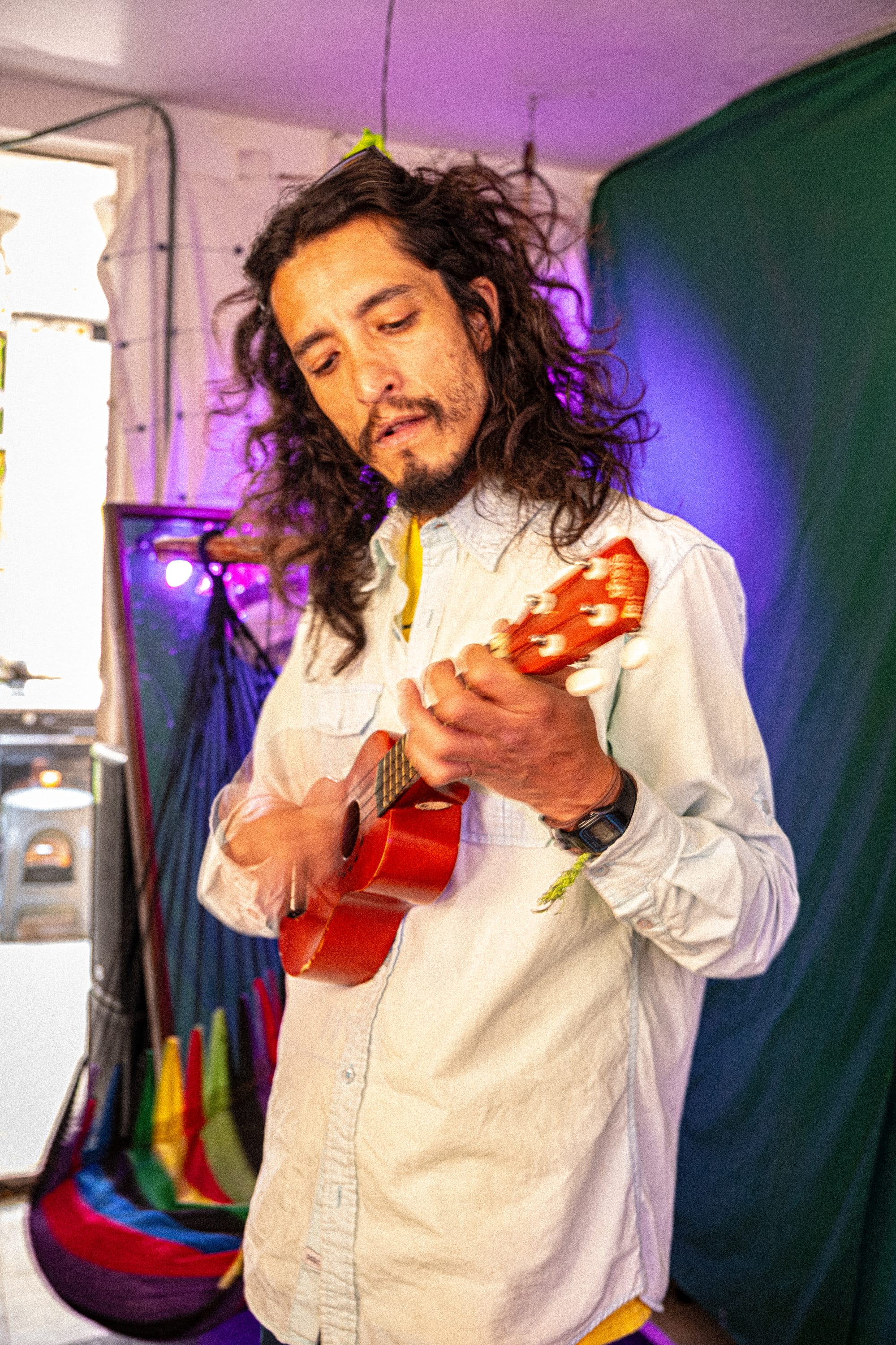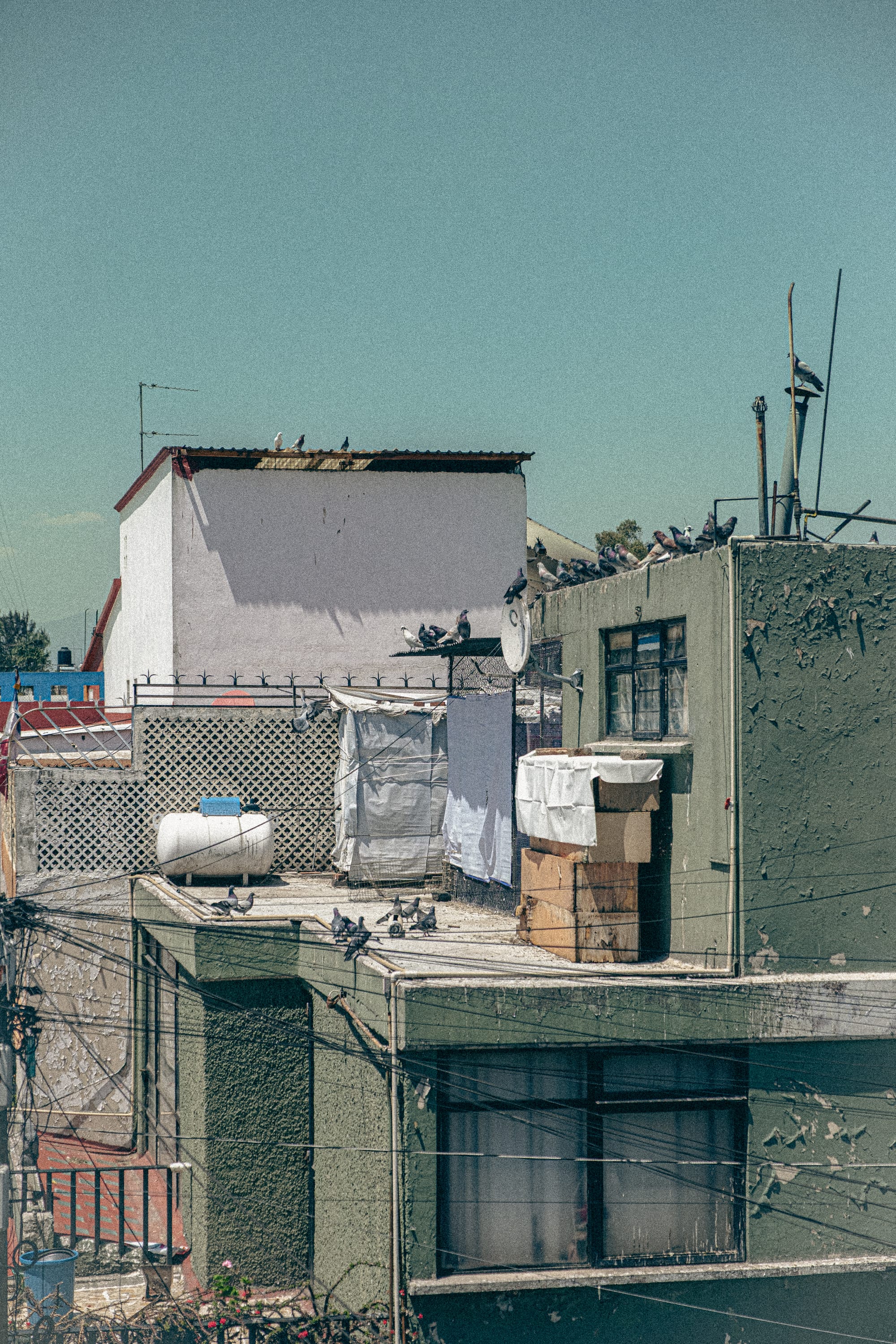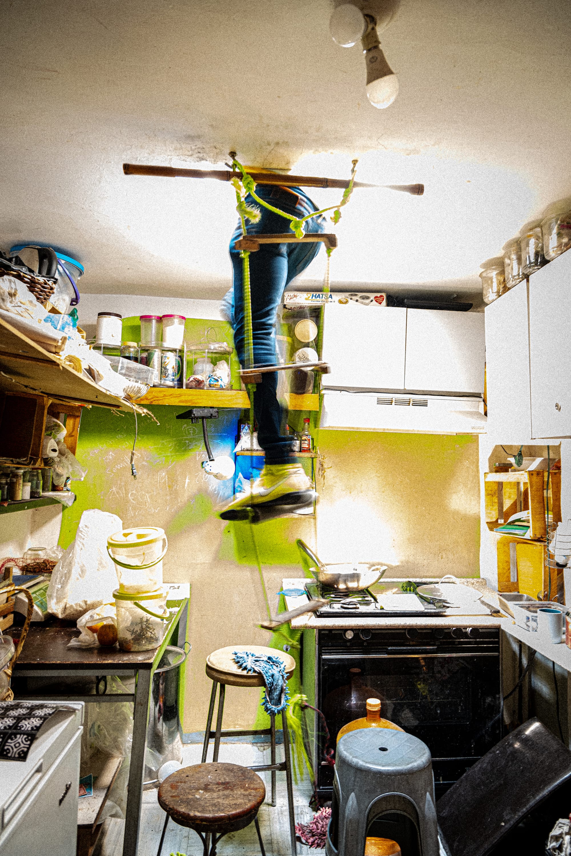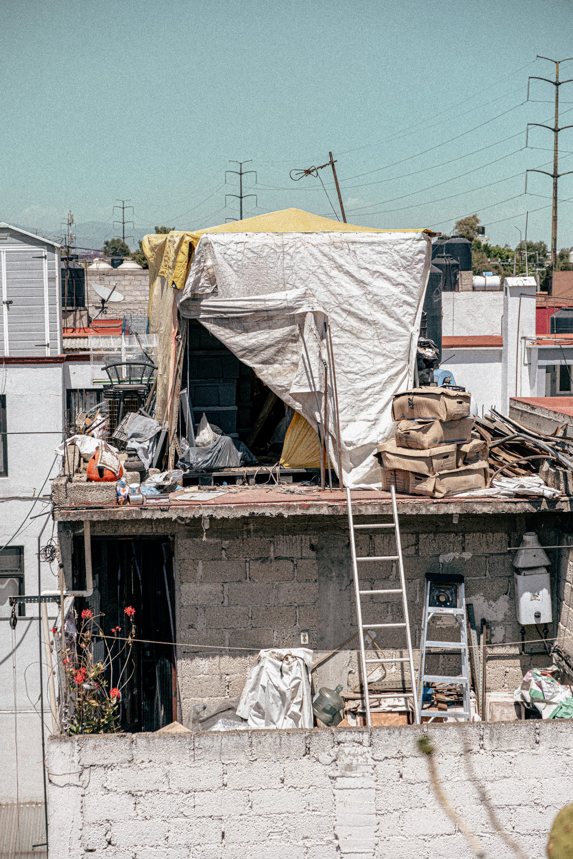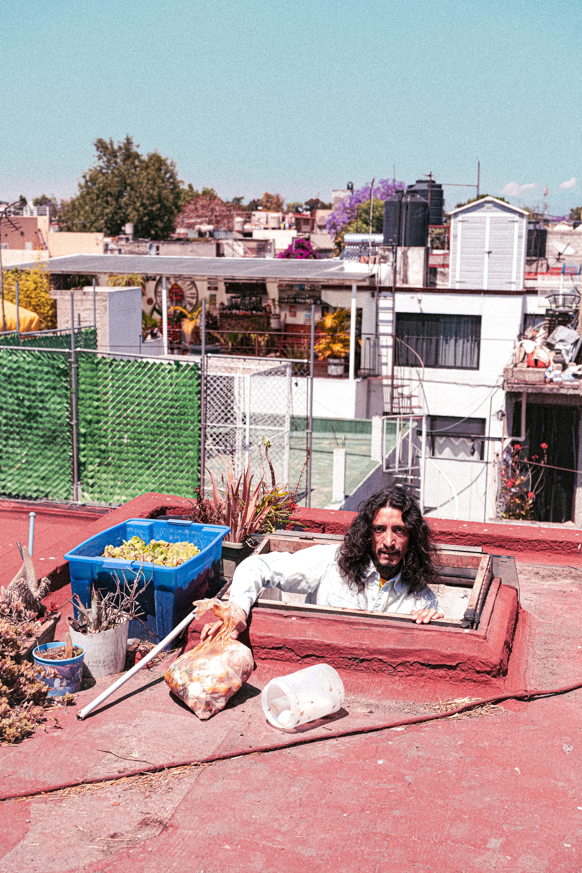 A few days later, we found ourselves in his kitchen, where a ladder had been attached to a small rooftop window. One by one, we climbed through it and up onto the roof.