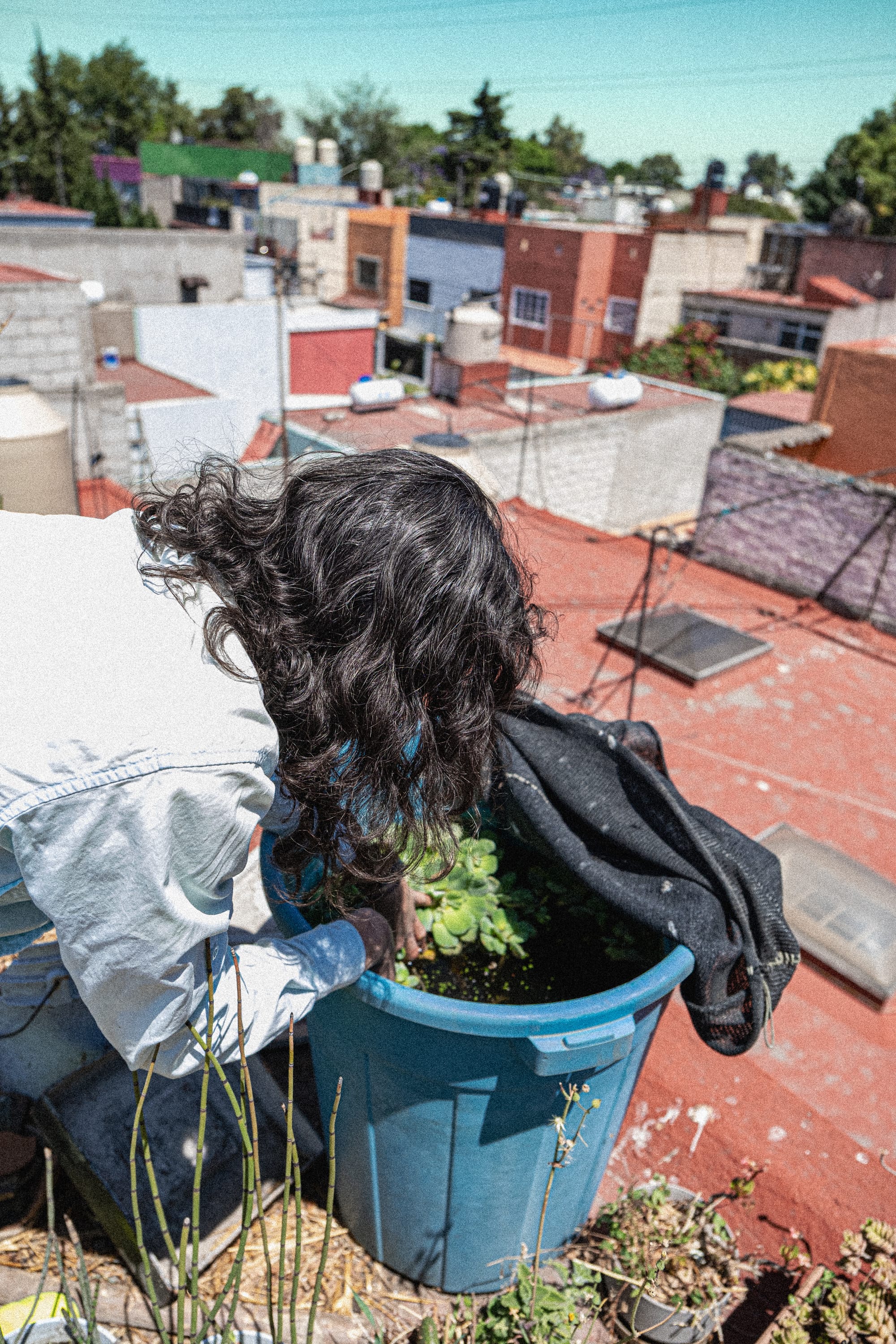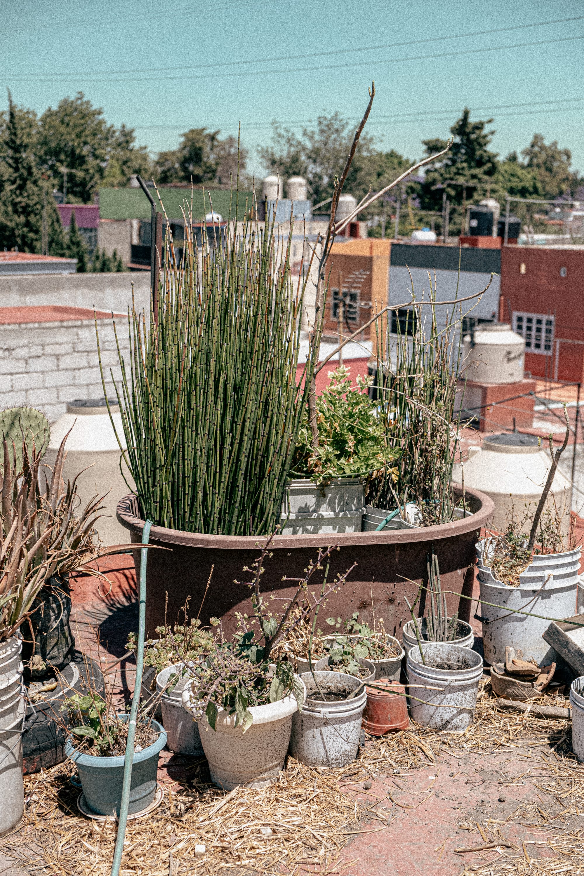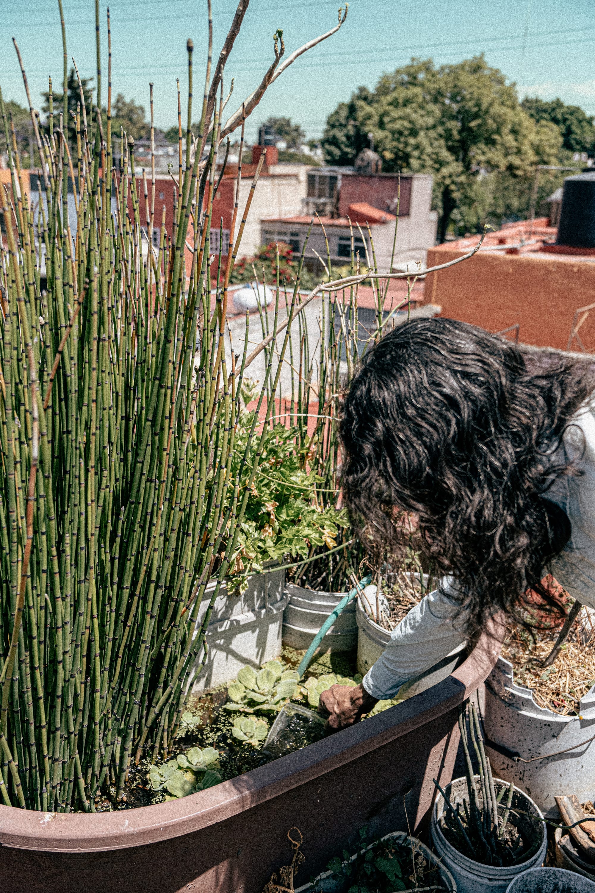 From the rooftop, the city stretches outward in every direction. Buildings, wires, rooftops, movement, all of it visible at once. And in the middle of that, this small, dense ecosystem. The contrast is immediate, but not jarring. It feels integrated, like a different layer of the same place. First a few containers, then more, then a patchwork of plants, soil, reused materials, and improvised systems. Amaranth is there, but not alone. It grows alongside other foods, herbs, and experiments.