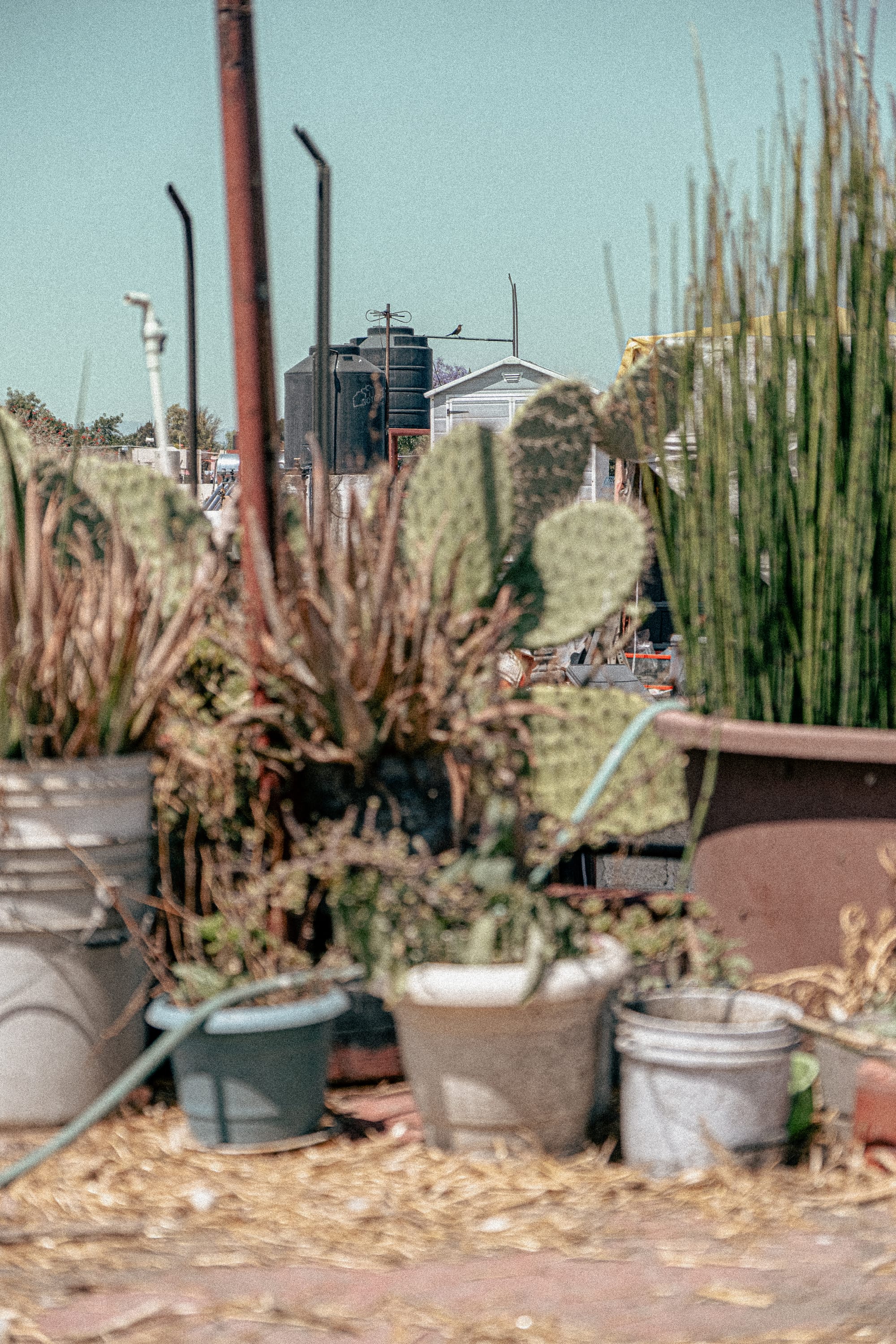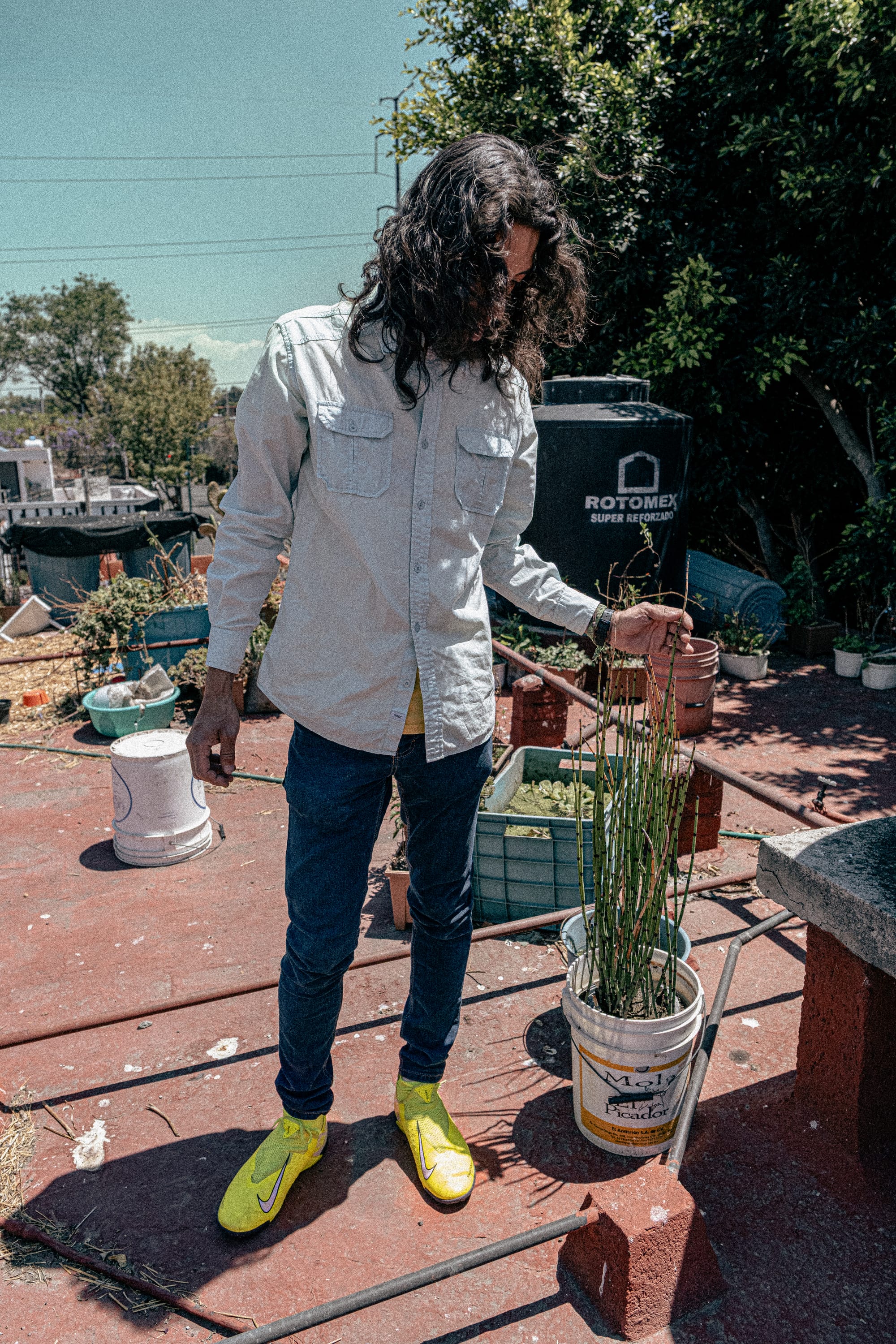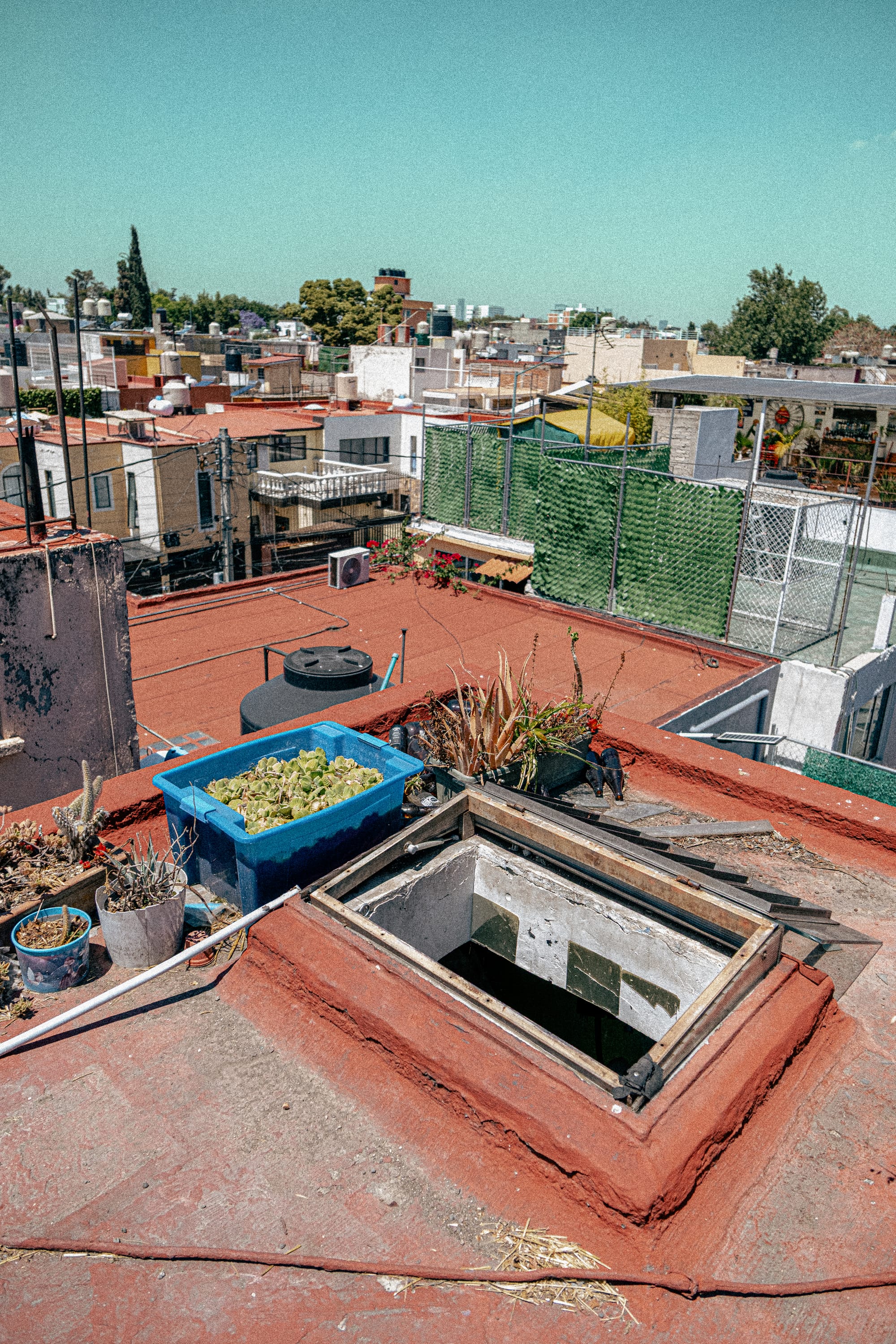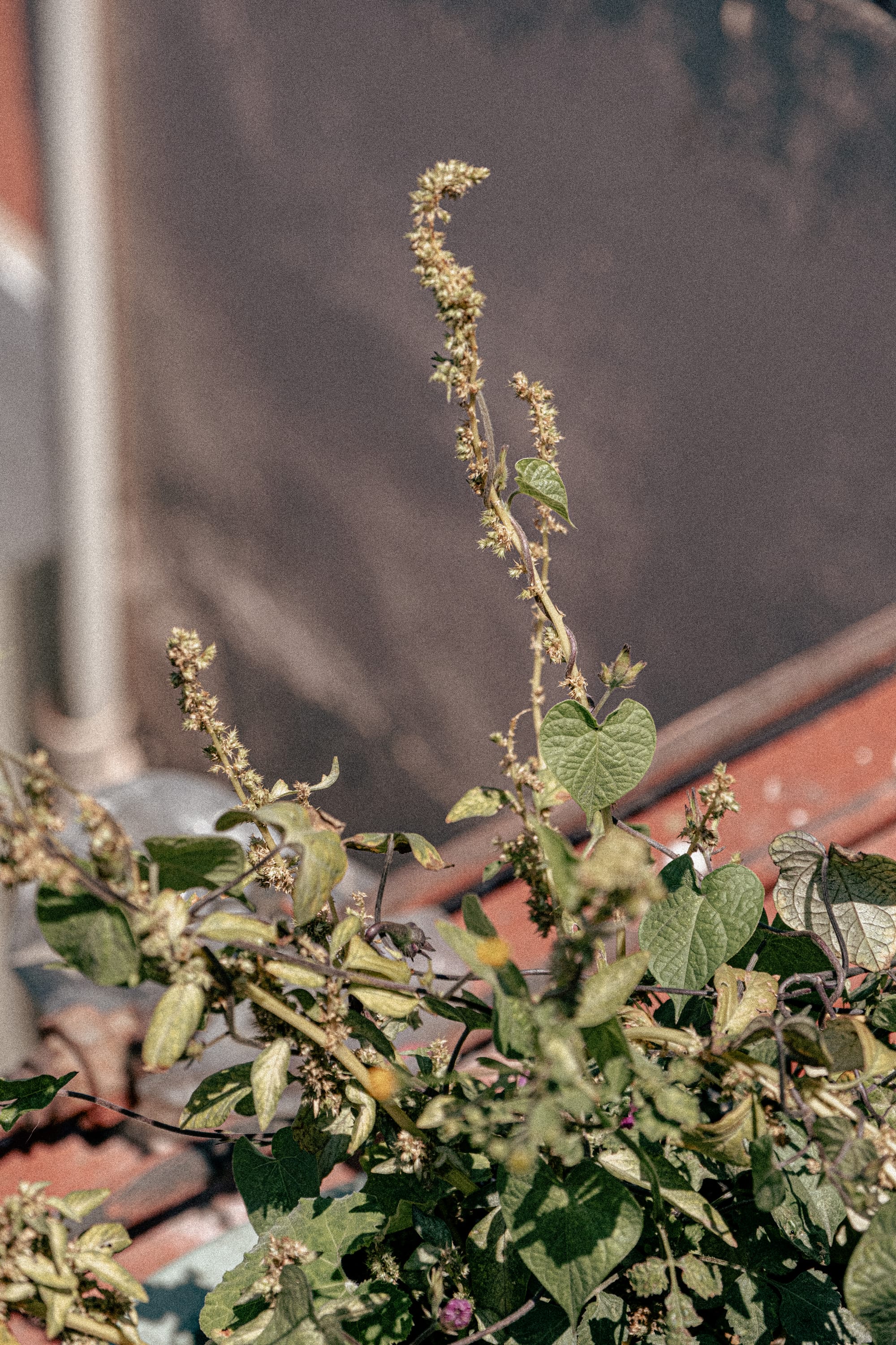 From the rooftop, the city stretches outward in every direction. Buildings, wires, rooftops, movement, all of it visible at once. And in the middle of that, this small, dense ecosystem. The contrast is immediate, but not jarring. It feels integrated, like a different layer of the same place. First a few containers, then more, then a patchwork of plants, soil, reused materials, and improvised systems. Amaranth is there, but not alone. It grows alongside other foods, herbs, and experiments.