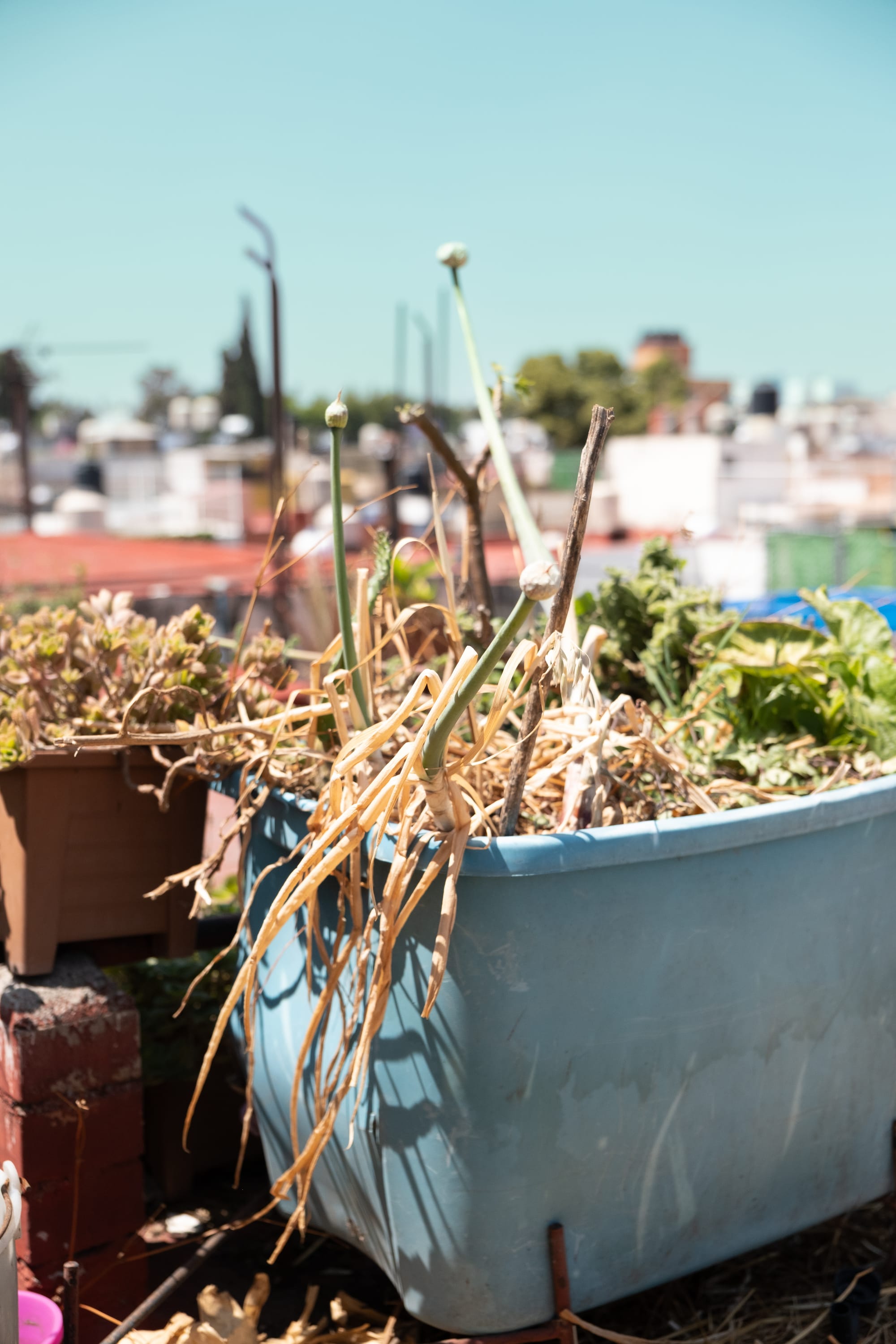 The rooftop holds multiple timelines at once, seeds just planted, others already mature, some drying, some ready to be shared. You can see the full arc of growth compressed into a single space.