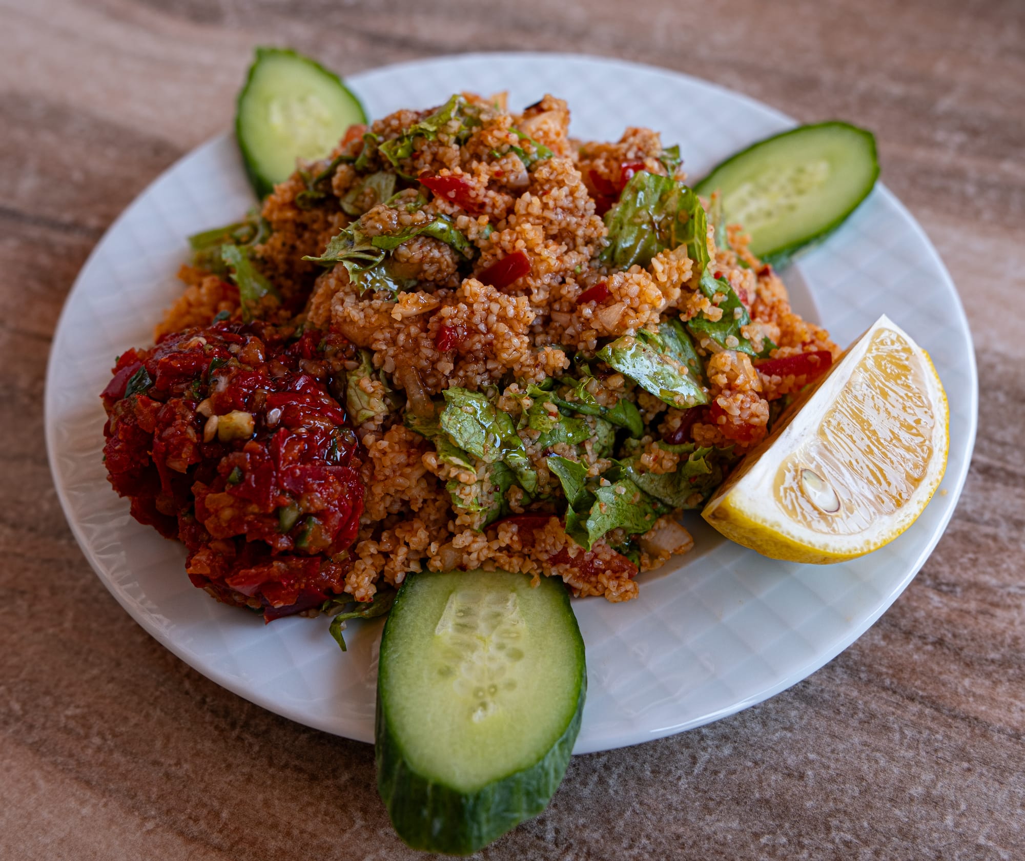 The menu here offers several plant-based options. We often started with a crisp, refreshing salad, piled high with fresh lettuce, cucumbers, tomatoes, and a squeeze of lemon. Their french fries, cooked fresh to order, were golden and crisp. The couscous salad was another favorite—light yet flavorful, with herbs and vegetables adding a bright, fresh bite. For something heartier, the rich and comforting bean stew was perfect, while the zeytinyağlı dolma (vine leaves stuffed with rice) provided that classic Turkish meze experience.