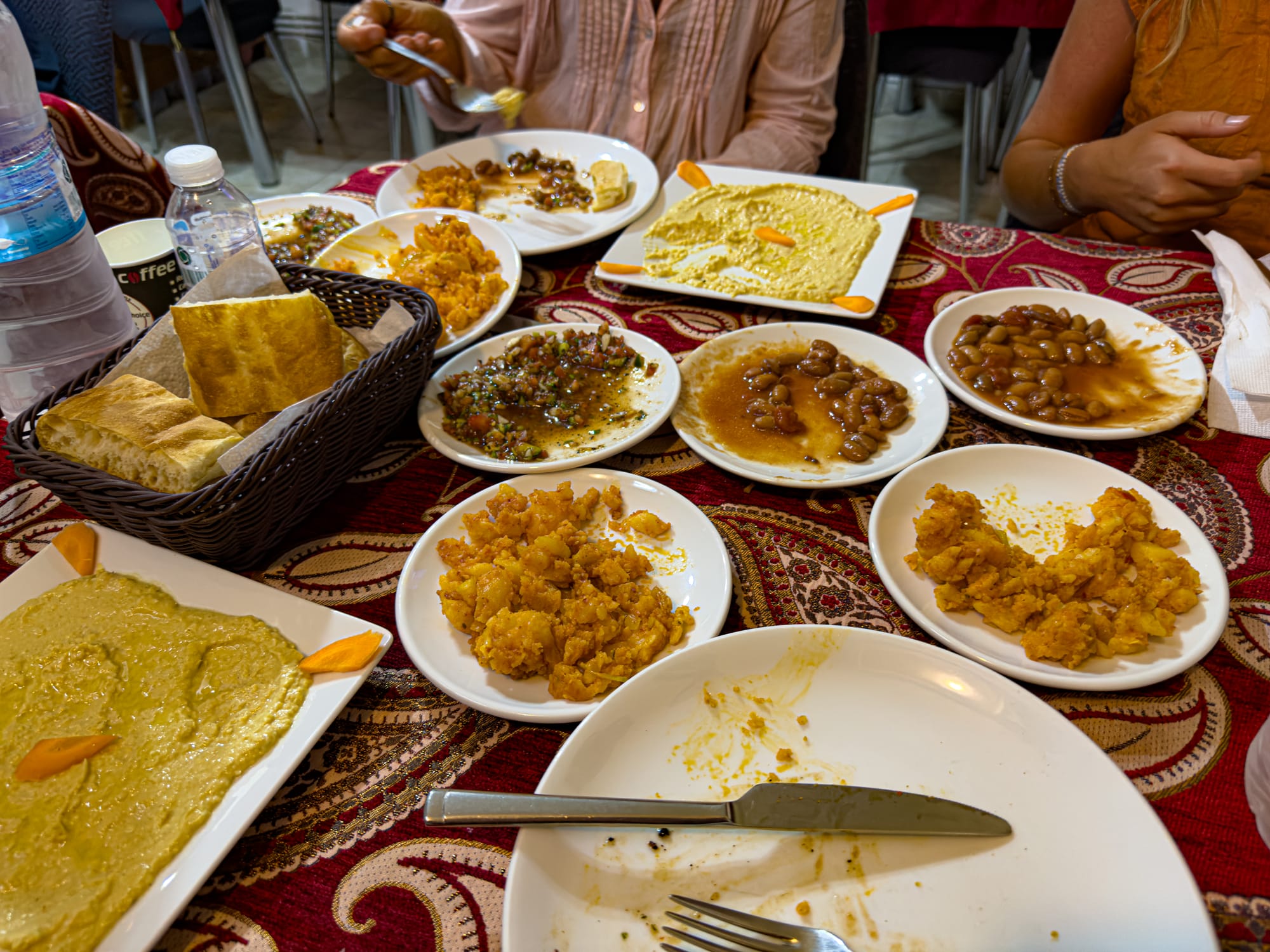 A generous spread at CanCan Restaurant, featuring hummus, bean dishes, fresh salads, and warm bread