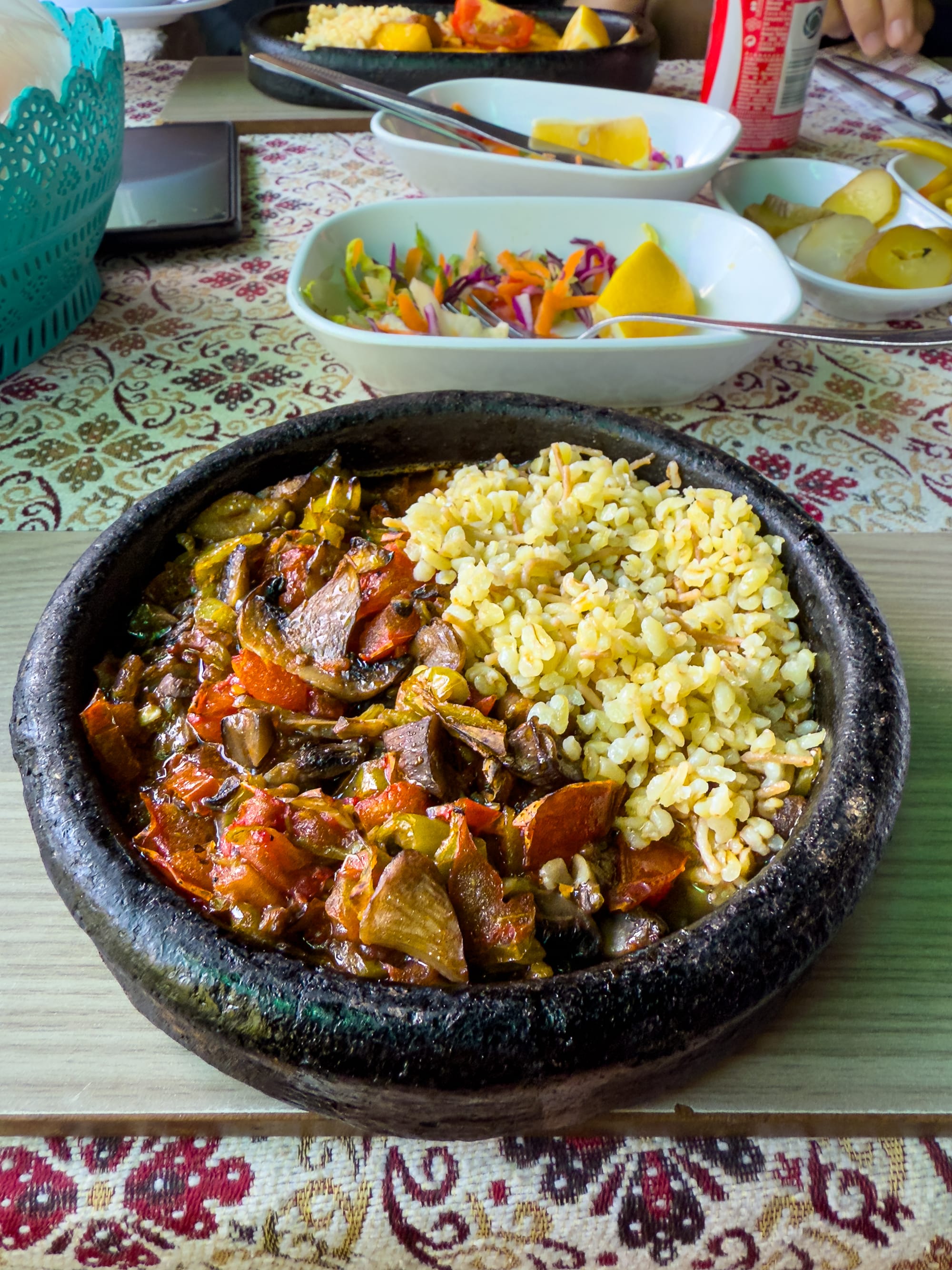 One of the most memorable highlights of our visits was when Bayram created a special vegan clay pot dish just for us—a local specialty of Cappadocia, traditionally cooked with meat, but here made entirely plant-based. Served with rice and salad, it was packed with flavor and felt like a true taste of the region, re-imagined for a vegan palate. Read our full post about it here.