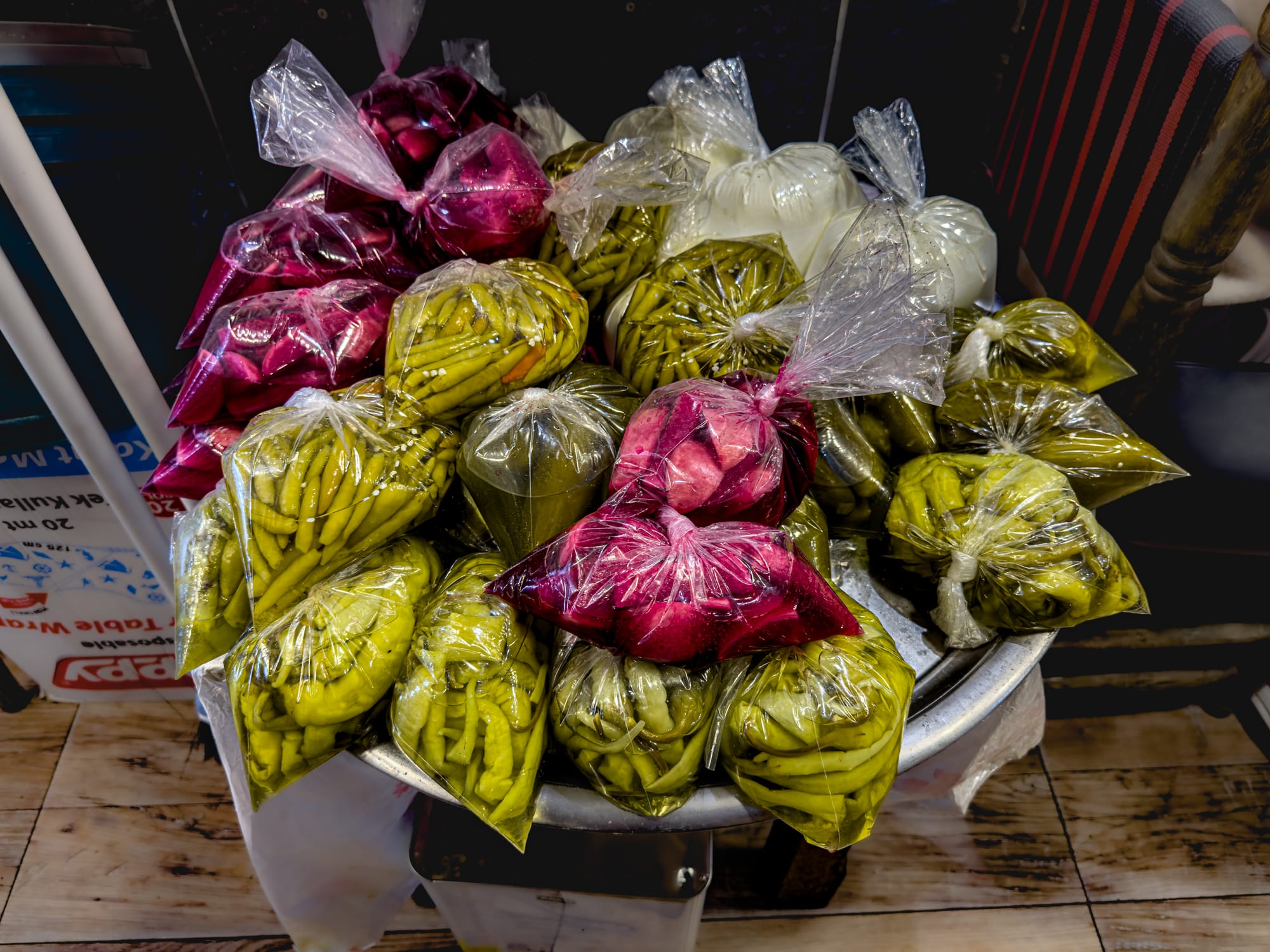 A pyramid of pickles at Buuzecedi, a vegetarian Syrian spot