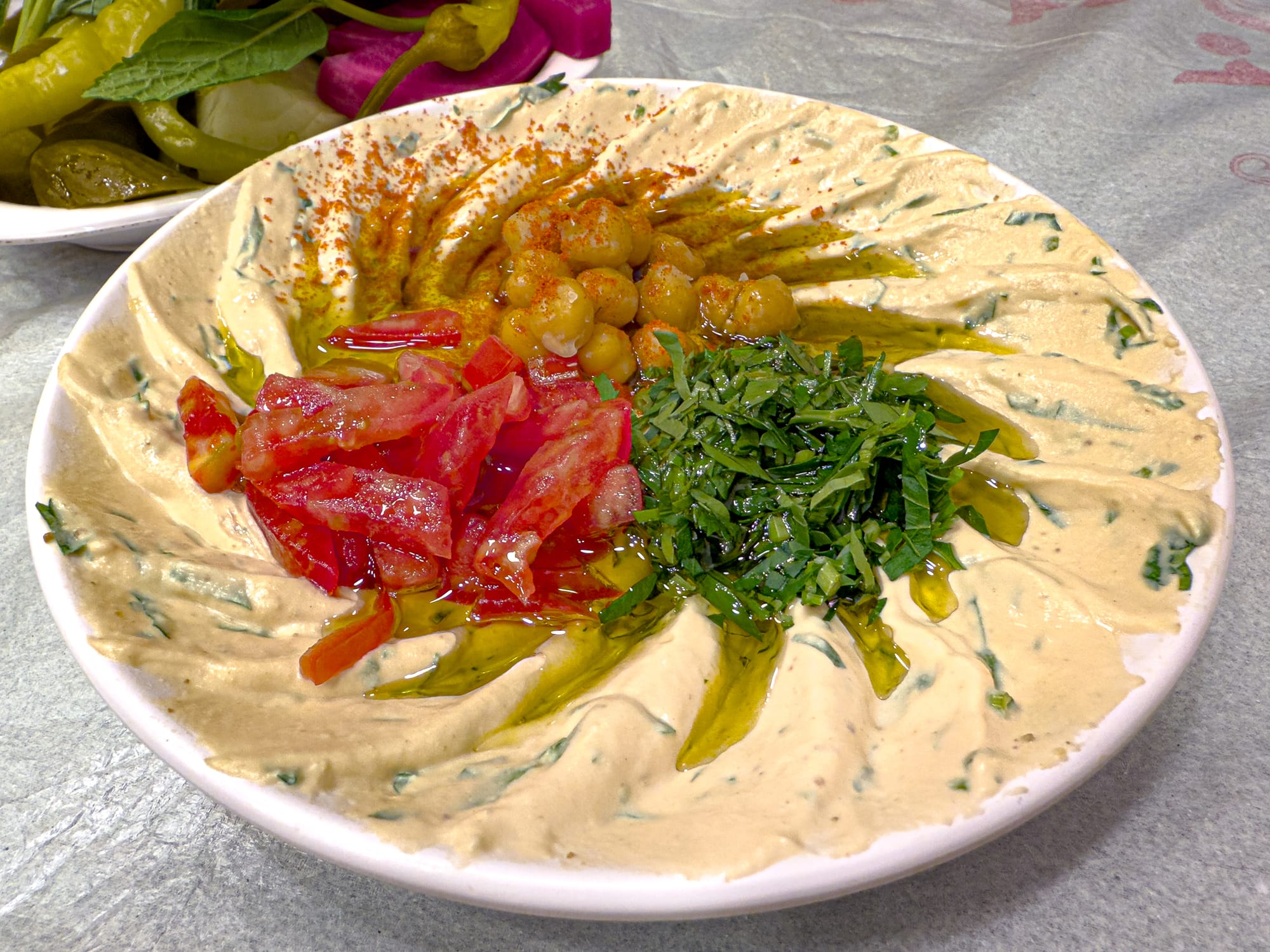 Everything is made in-house, and you can feel it—from the rich, creamy hummus to the mountains of freshly prepped chickpeas stacked in the back like small monuments to slow cooking.