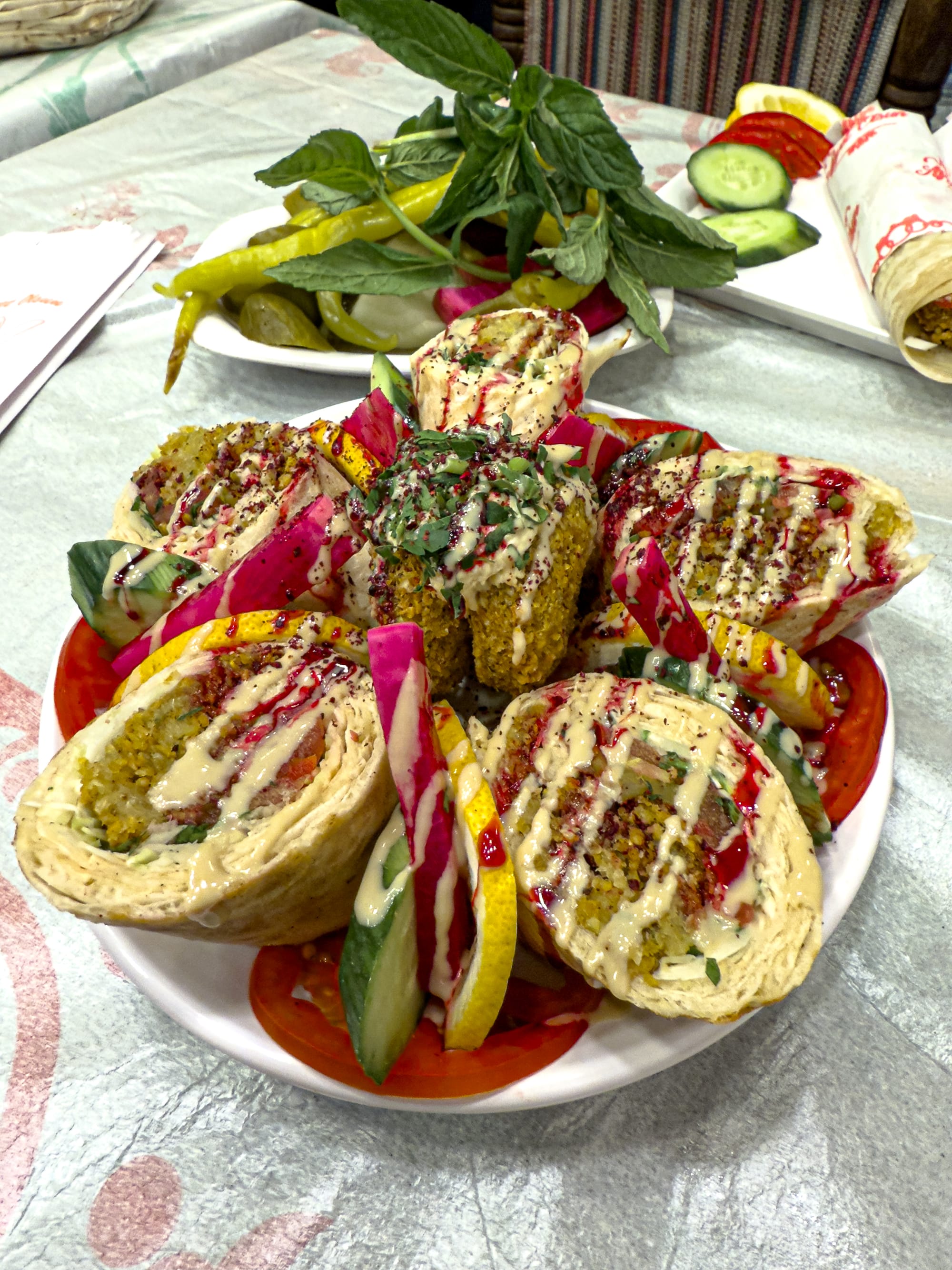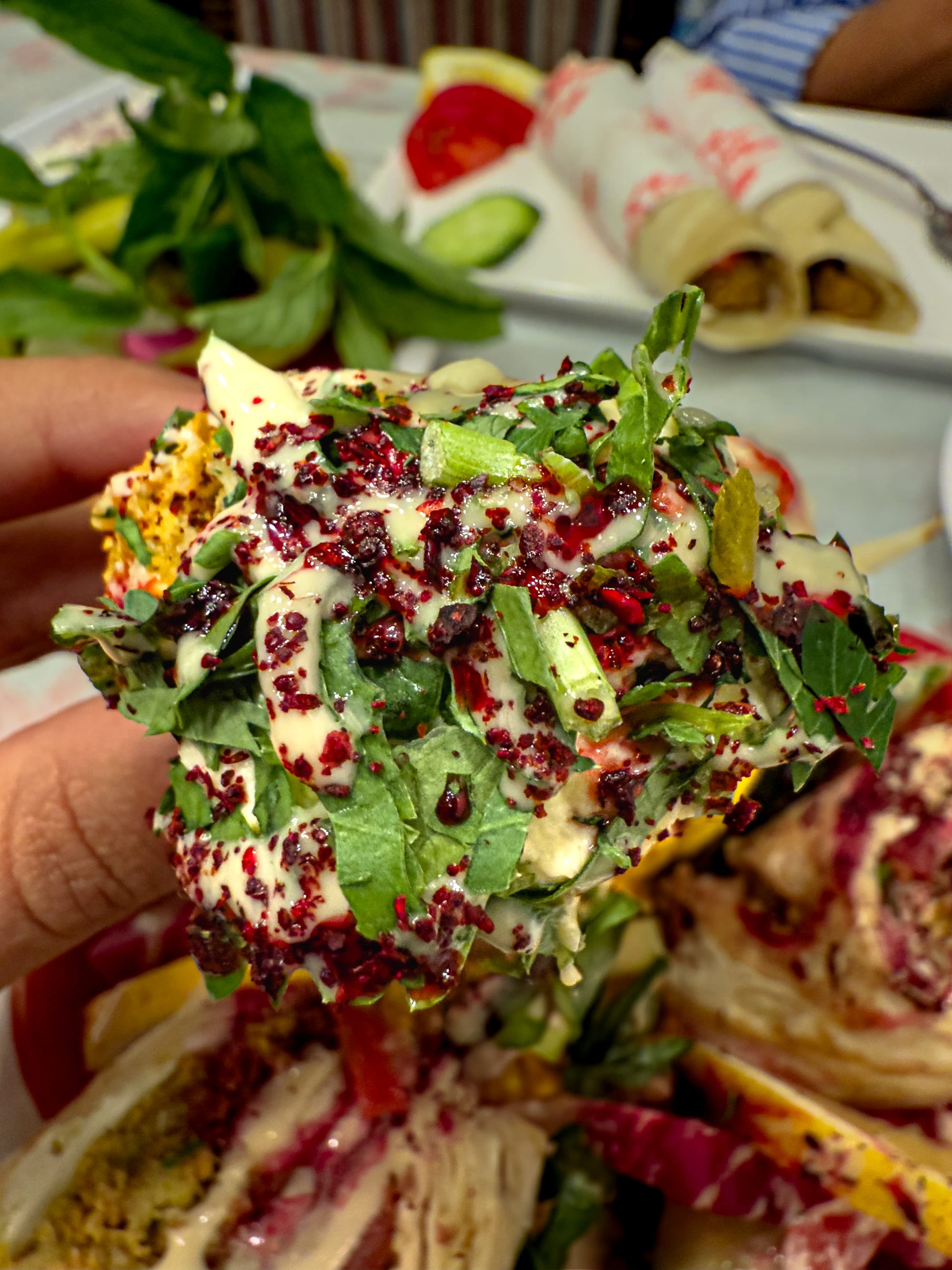 Falafel wraps, sumac-drizzled herbs, and creamy hummus made fresh at Buuzecedi