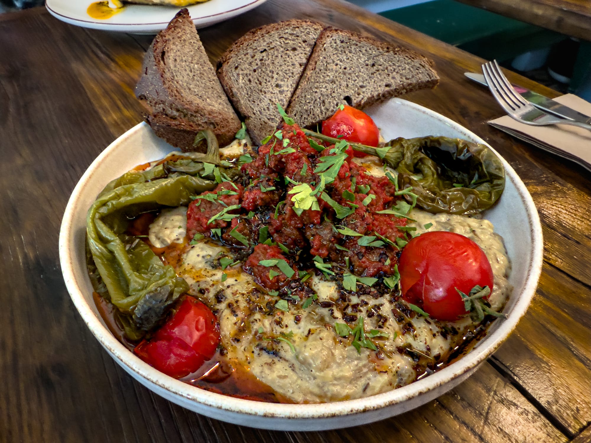 Vegan Dükkan Lokanta’s standout mains—a rich smoked eggplant and their signature börek topped with cashew yogurt
