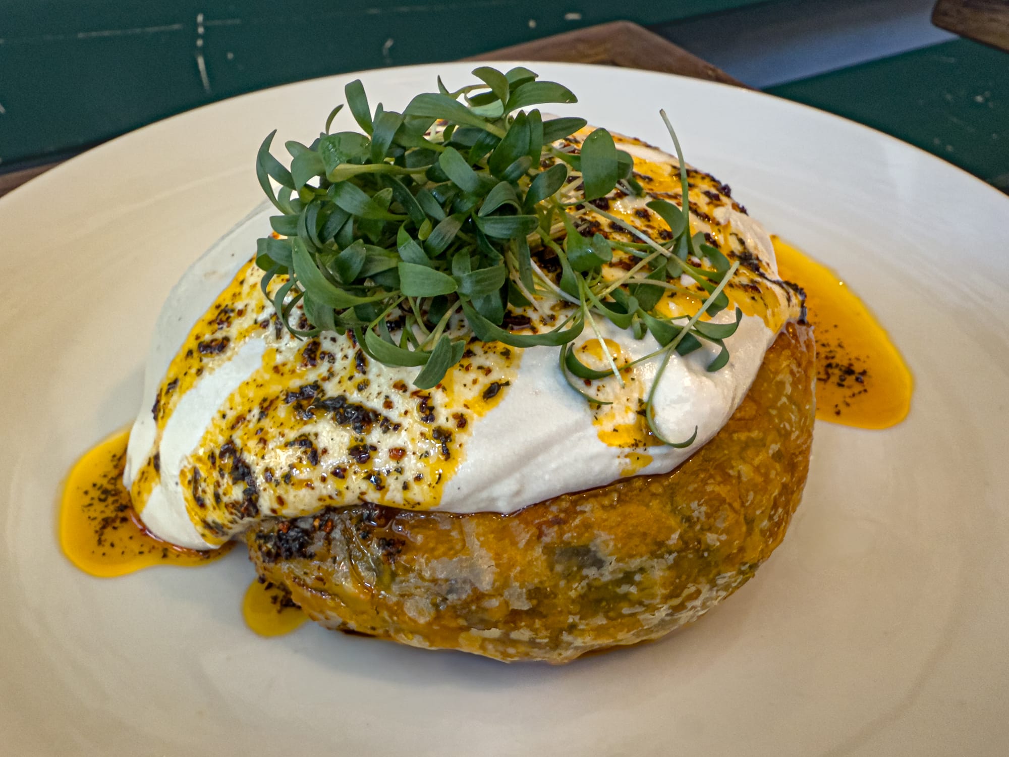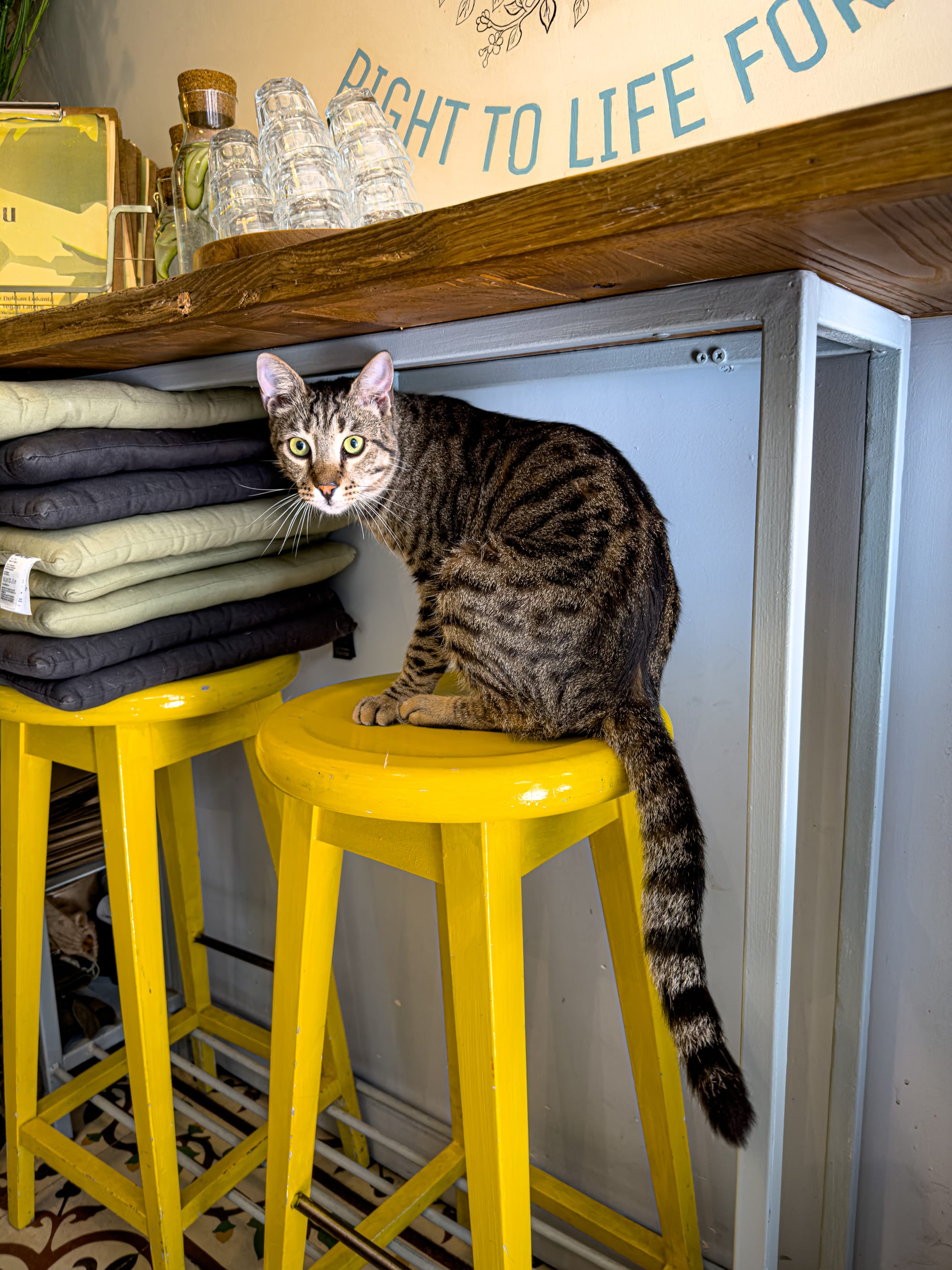 The interior is warm and vibrant, full of plants, light, and small thoughtful details. On our visit, a tabby cat perched contentedly on a yellow stool—adding to the homey, lived-in atmosphere. It’s the kind of place that doesn’t just serve great food, but radiates a kind of ethos. You feel the care in every bite.