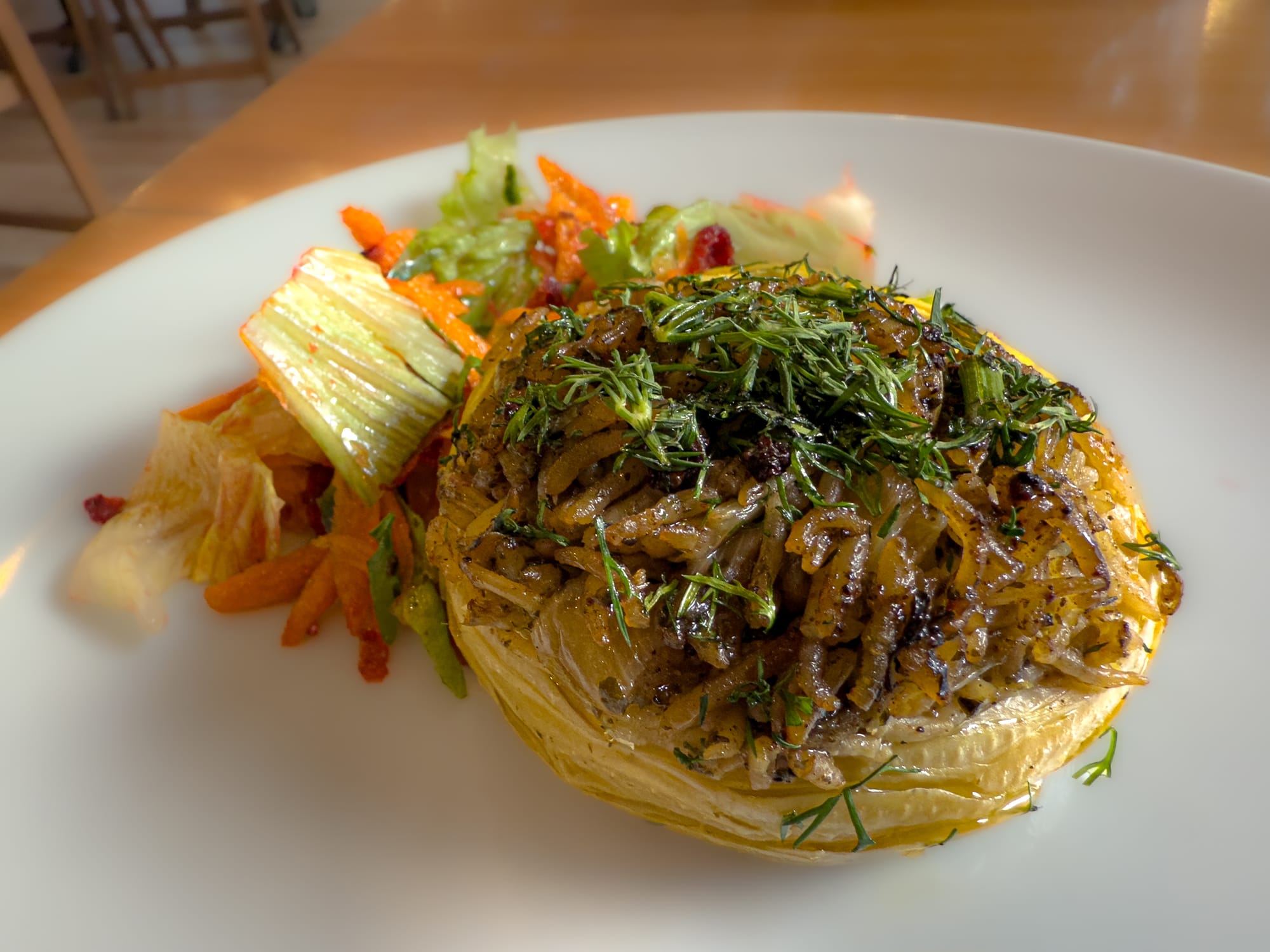 We tried the vegan spinach mantı, which was stuffed with lentils and served in a generous pool of vegan yogurt sauce and spiced oil. It was hearty and satisfying, with a soft, handmade feel to the dough and just the right amount of bite. Alongside it, we ordered the pumpkin-stuffed momos—fragrant, lightly spiced, and shaped into the kind of dumplings you want to eat by the handful.