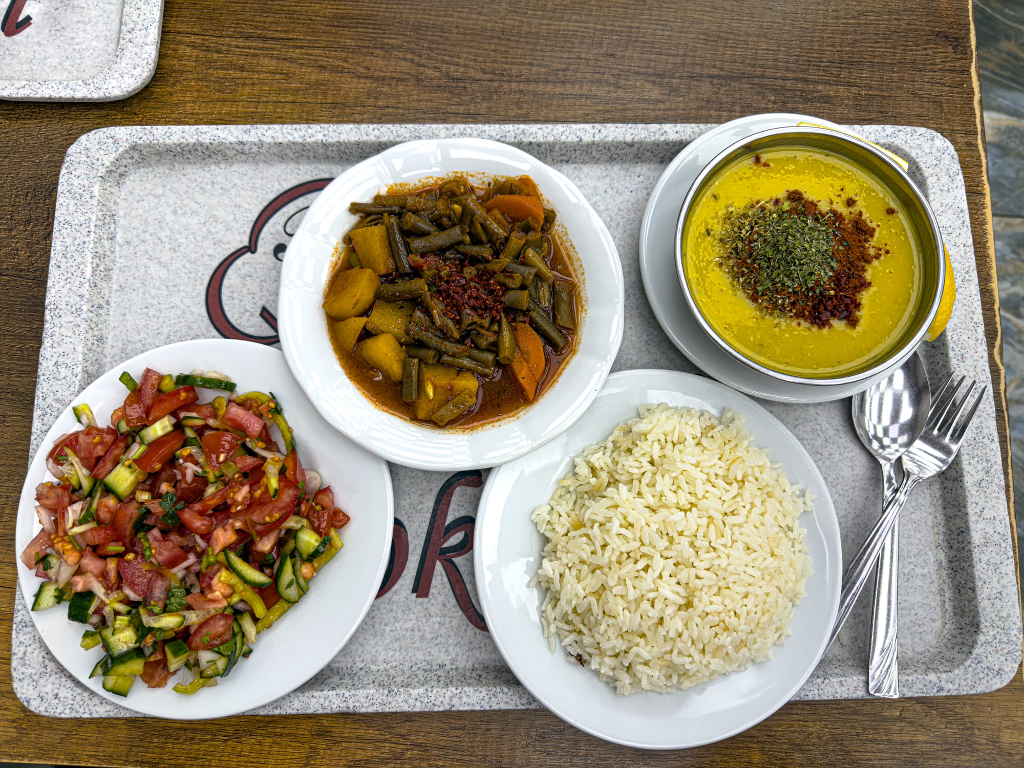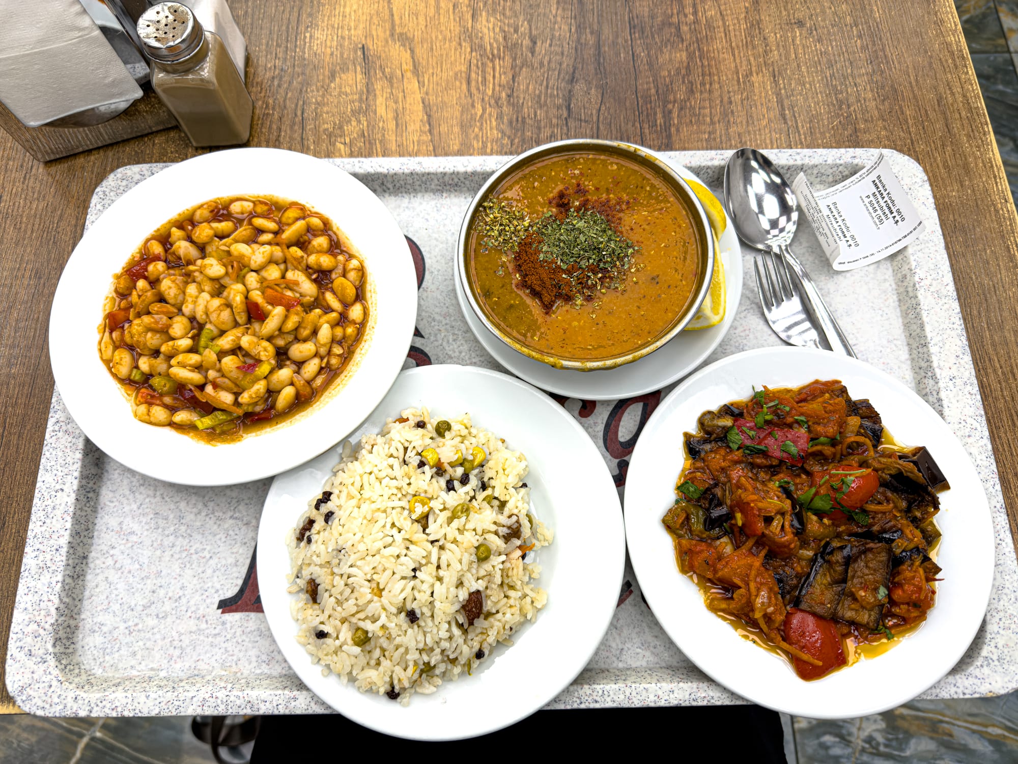 Vegan lokanta spread: white beans, lentil soup, roasted eggplant, olive oil vegetables, and pilav