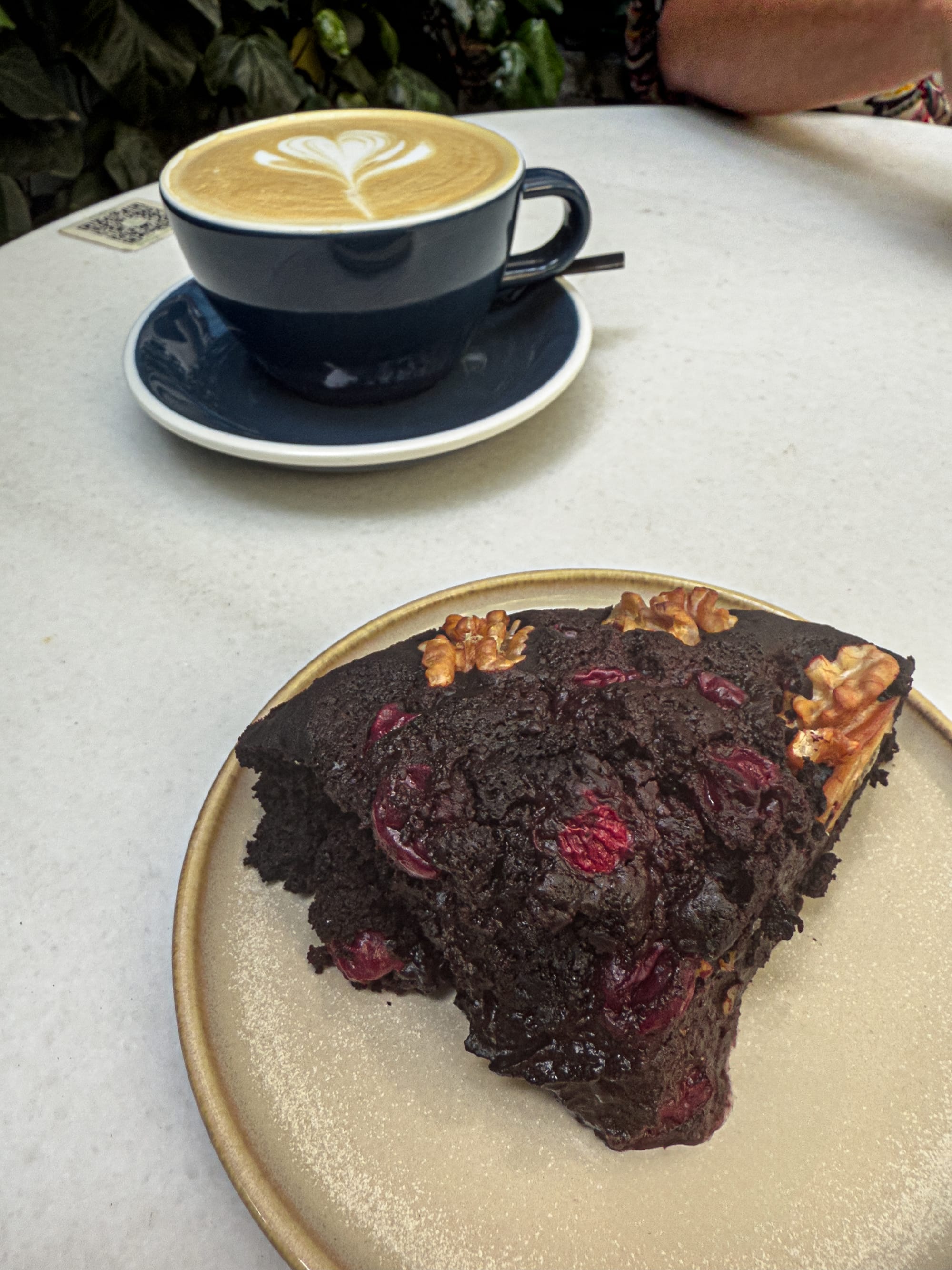 A vegan brownie and oat latte from a cozy café and a vegan food market spotted in Kadıköy