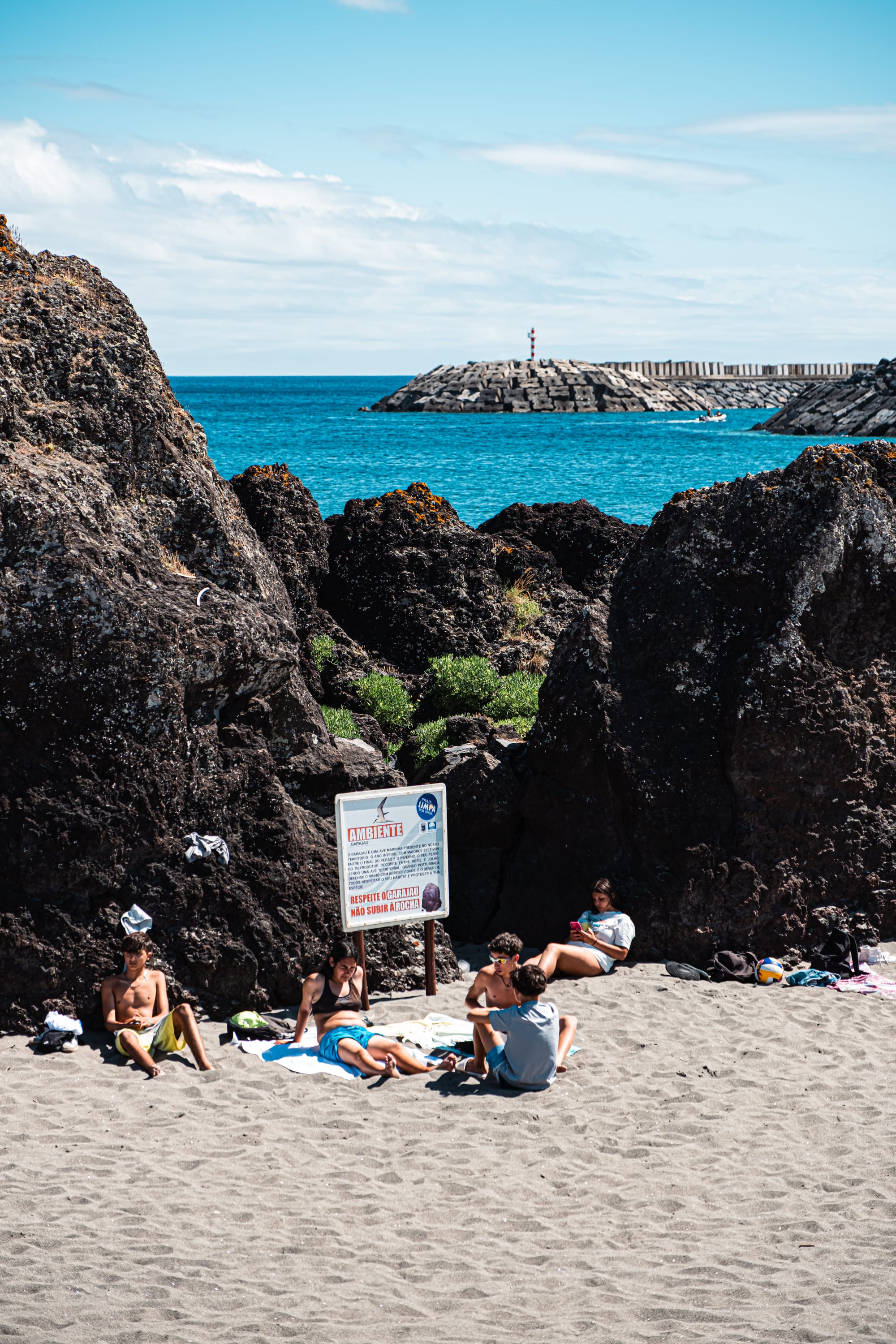 Sunbathers on Praia Vinha d’Areia, tucked between cliffs and marina walls