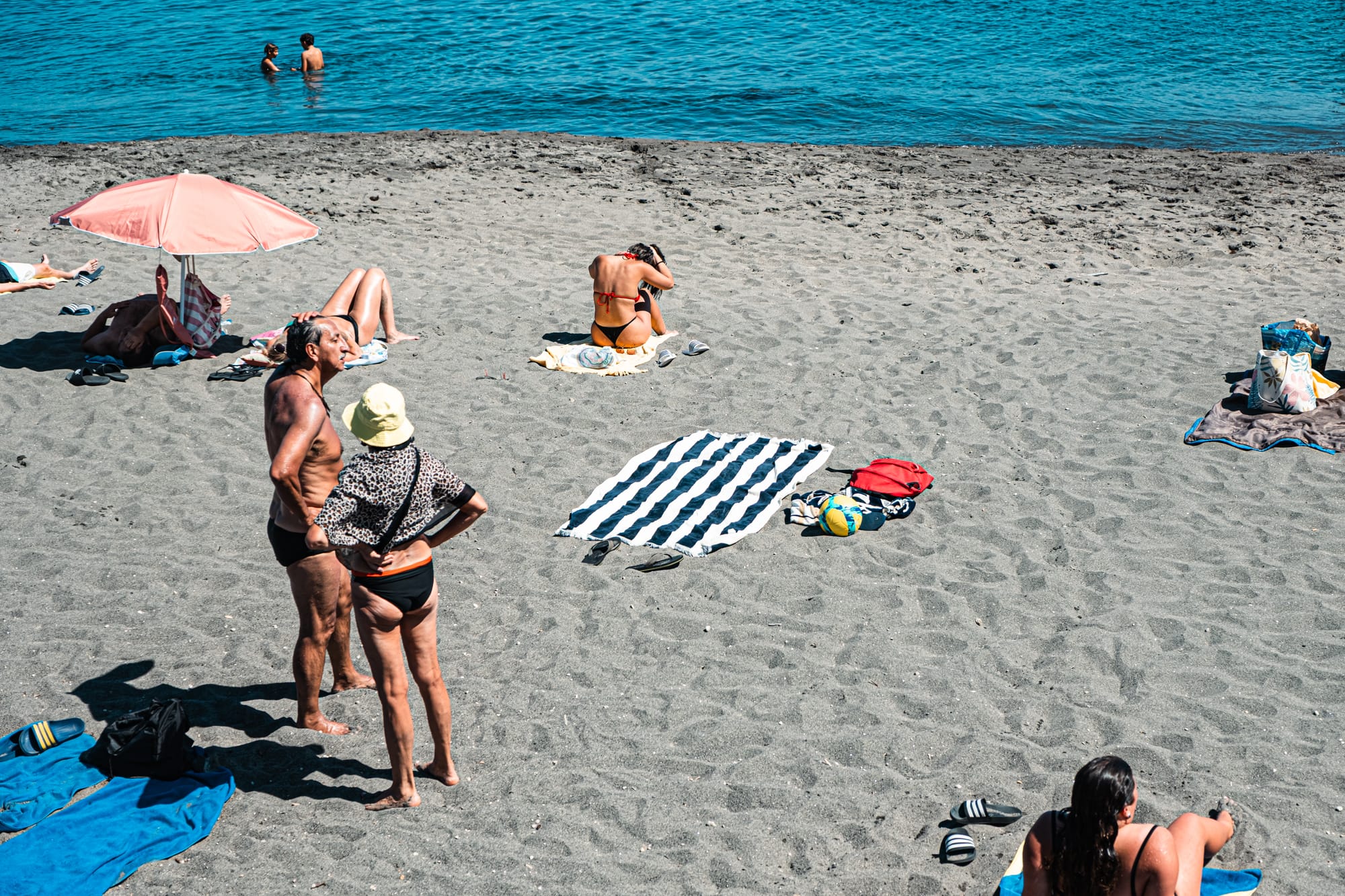The sand is dark, almost volcanic. Rock formations rise at either end of the cove, offering shelter and shade. The water is shallow and usually calm, ideal for long swims or floating aimlessly.